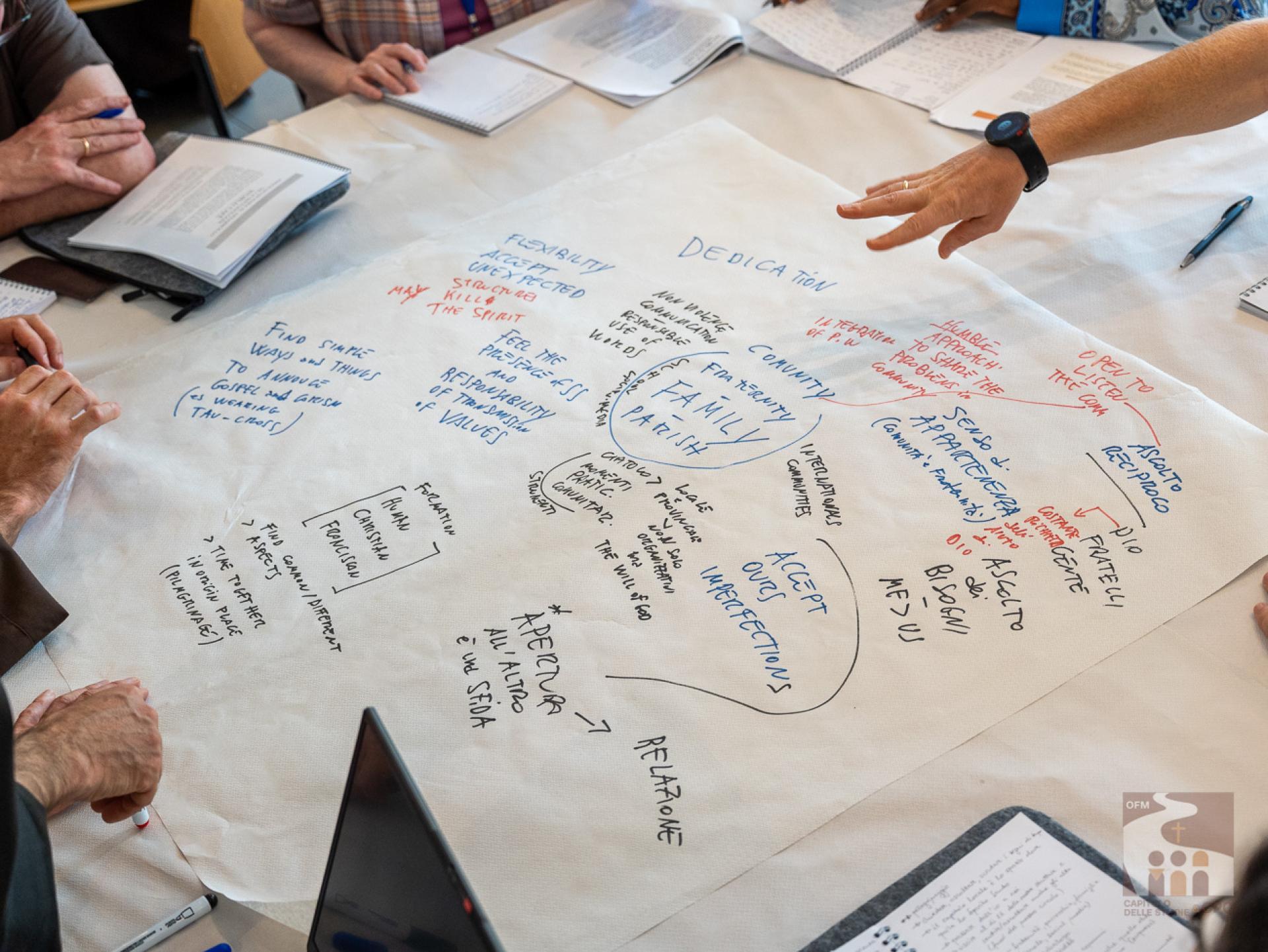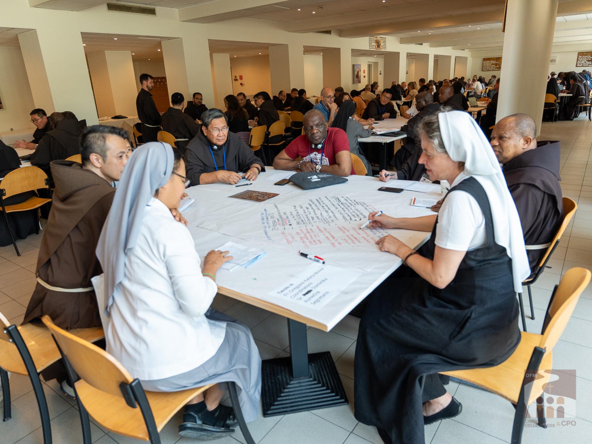 The participants then began the working methodology of the “World Café”: they were divided in rotation into 18 international tables, that is, not by language and always changing the interlocutors, and they answered the 3 questions expressed in the Instrumentum Laboris on the Charism (page 19). The works were then presented in the assembly end-of-day plenary: the secretaries of the tables presented their responses, implementing them with those of other tables. The results of today and the next two days will then be collected in the Final Document of the Chapter of Mats.A curiosity about the international tables: although the capitulars come from about 50 countries around the world, the diversity of languages was not a problem, both because the secretaries of each table spoke several languages, and because - as Br. Cesare Vaiani, General Definitor, said - "the Spirit of Pentecost helped us".