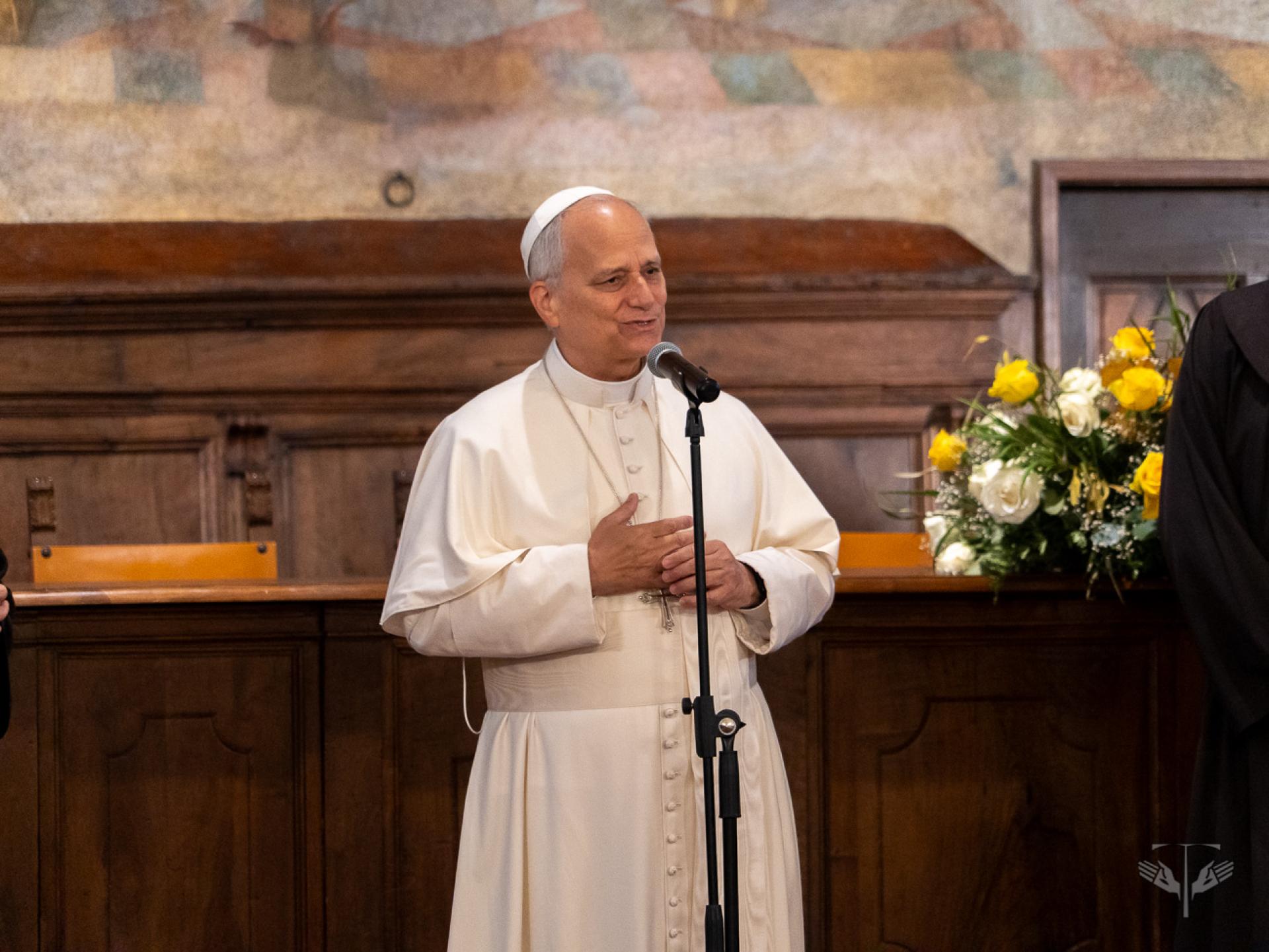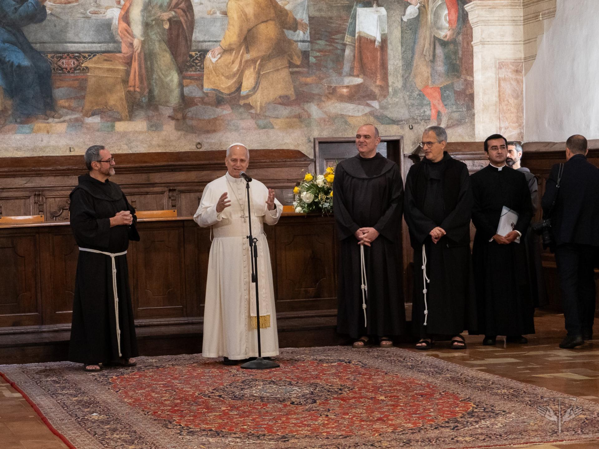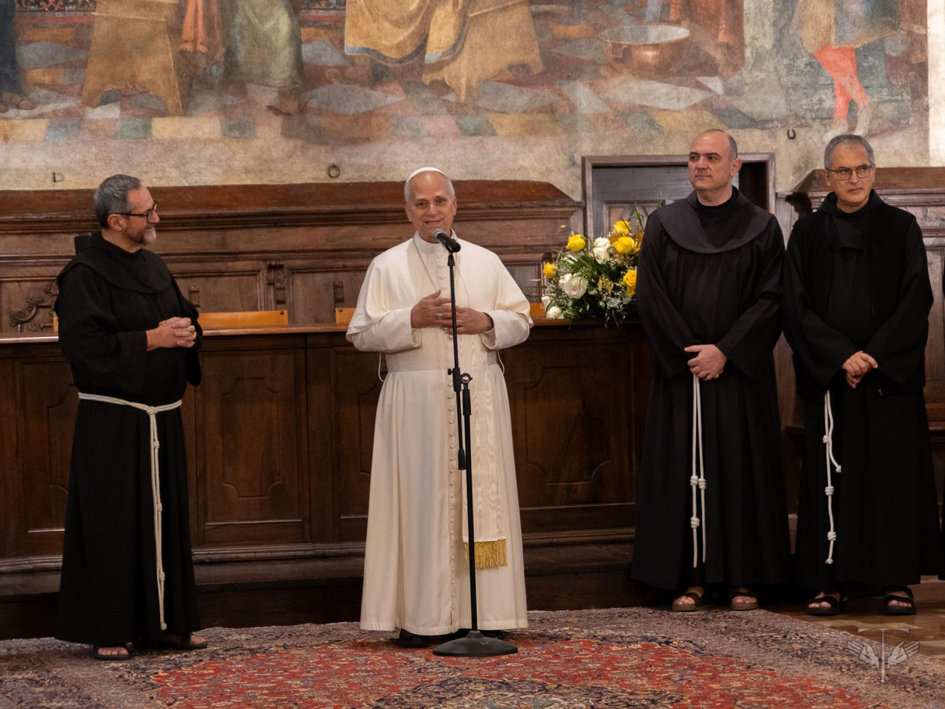 The Holy Father recalled the example of the Poverello-The Poor Man of Assisi in the very place where he lived: "In this place, St. Francis and the first friars lived to the full what, in today's language, we call 'synodal style'. Together, in fact, they shared the different stages of their journey; together they went to Pope Innocent III; Together, from year to year, they perfected and enriched the initial text". Leo XIV highlighted that "this convinced choice of fraternity, which is the heart of the Franciscan charism together with minority, was inspired by an intrepid and persevering faith", concluding: "May the example of St. Francis also give us the strength to make choices inspired by an authentic faith and to be, as a Church, a sign and witness of the Kingdom of God in the world".