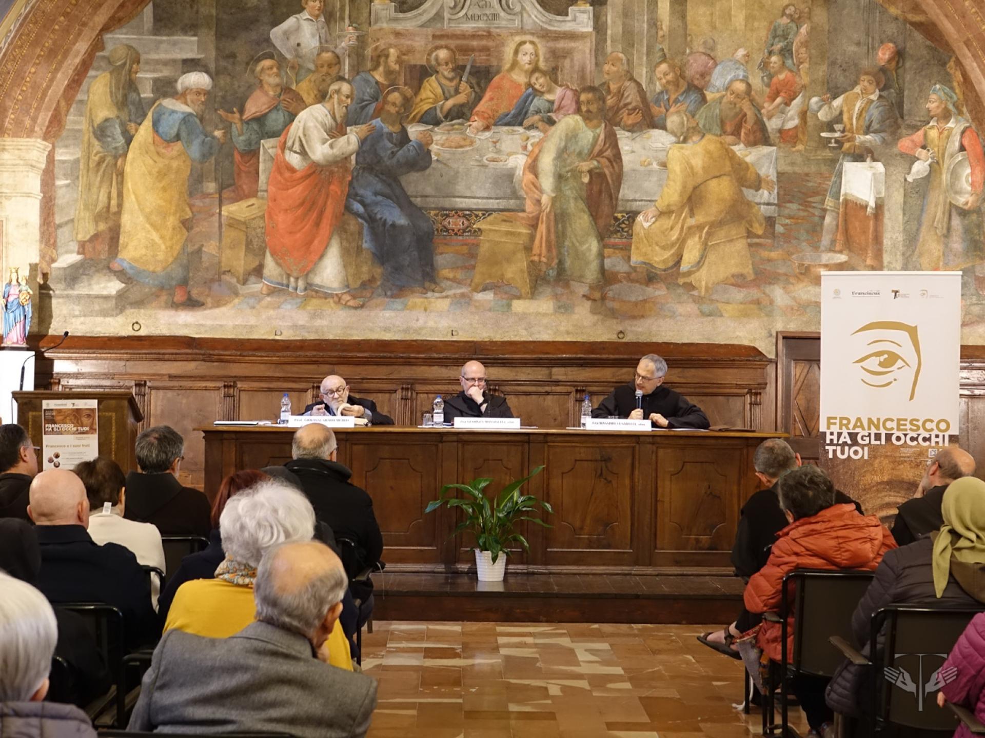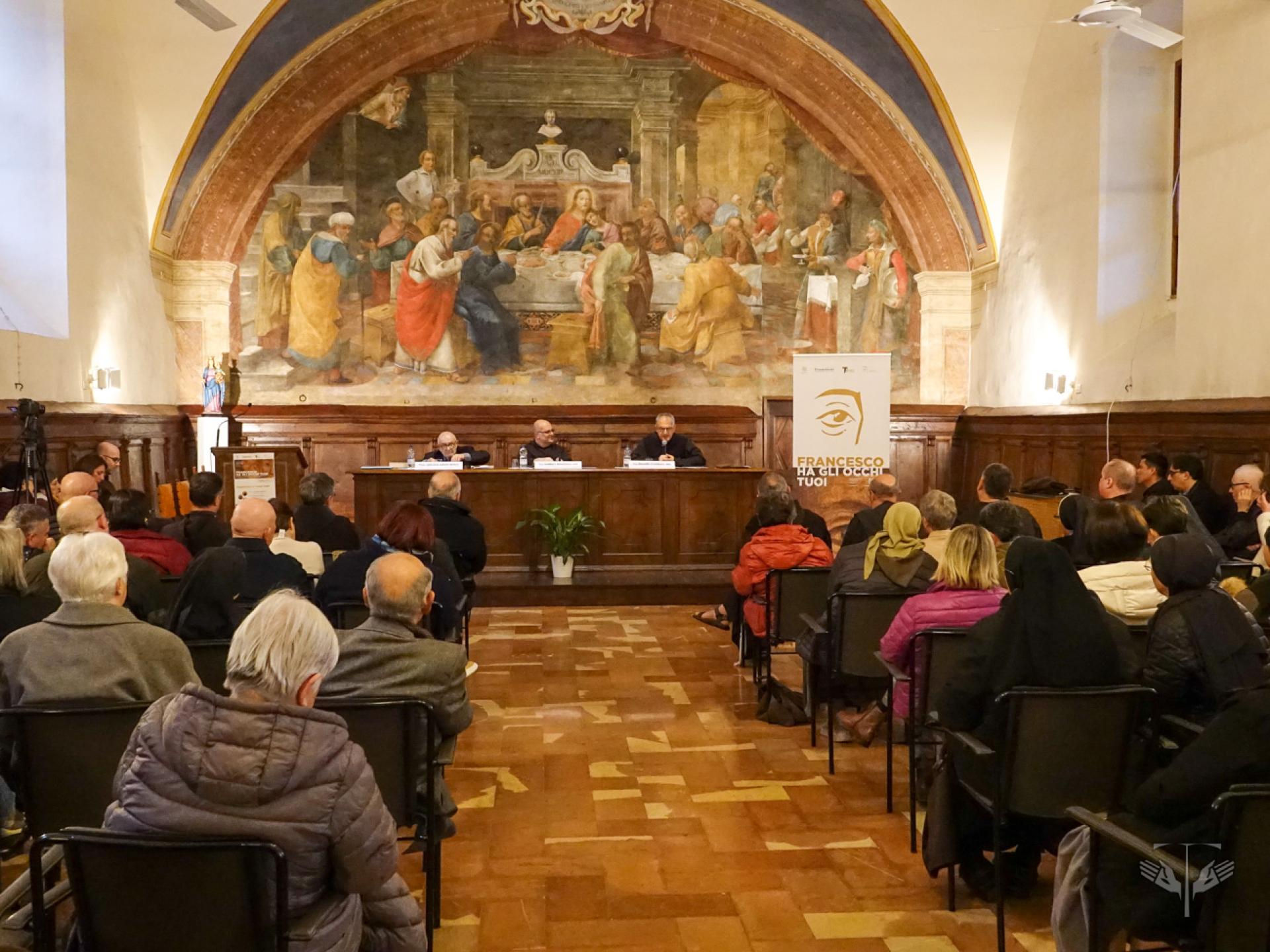 On Saturday, 7th March, the third event of the series ‘Francesco ha gli occhi tuoi’ (Francis has your eyes) took place in Assisi. Organised by the Seraphic Province OFM of Assisi, it accompanies us on a journey of rediscovery of the Poverello in this Franciscan Year, marking the eighth centenary of his death. The refectory of the Basilica of Our Lady of the Angels, a few steps from the Porziuncola, hosted the meeting entitled ‘Francis and his friars,’ which featured Giovanni Grado Merlo, professor emeritus at the State University of Milan, as historian, Fr Massimo Fusarelli, Minister General of the OFM, as actualiser, and Fr Georges Massinelli, professor of Sacred Scripture at the Pontifical University Antonianum in Rome, as moderator.