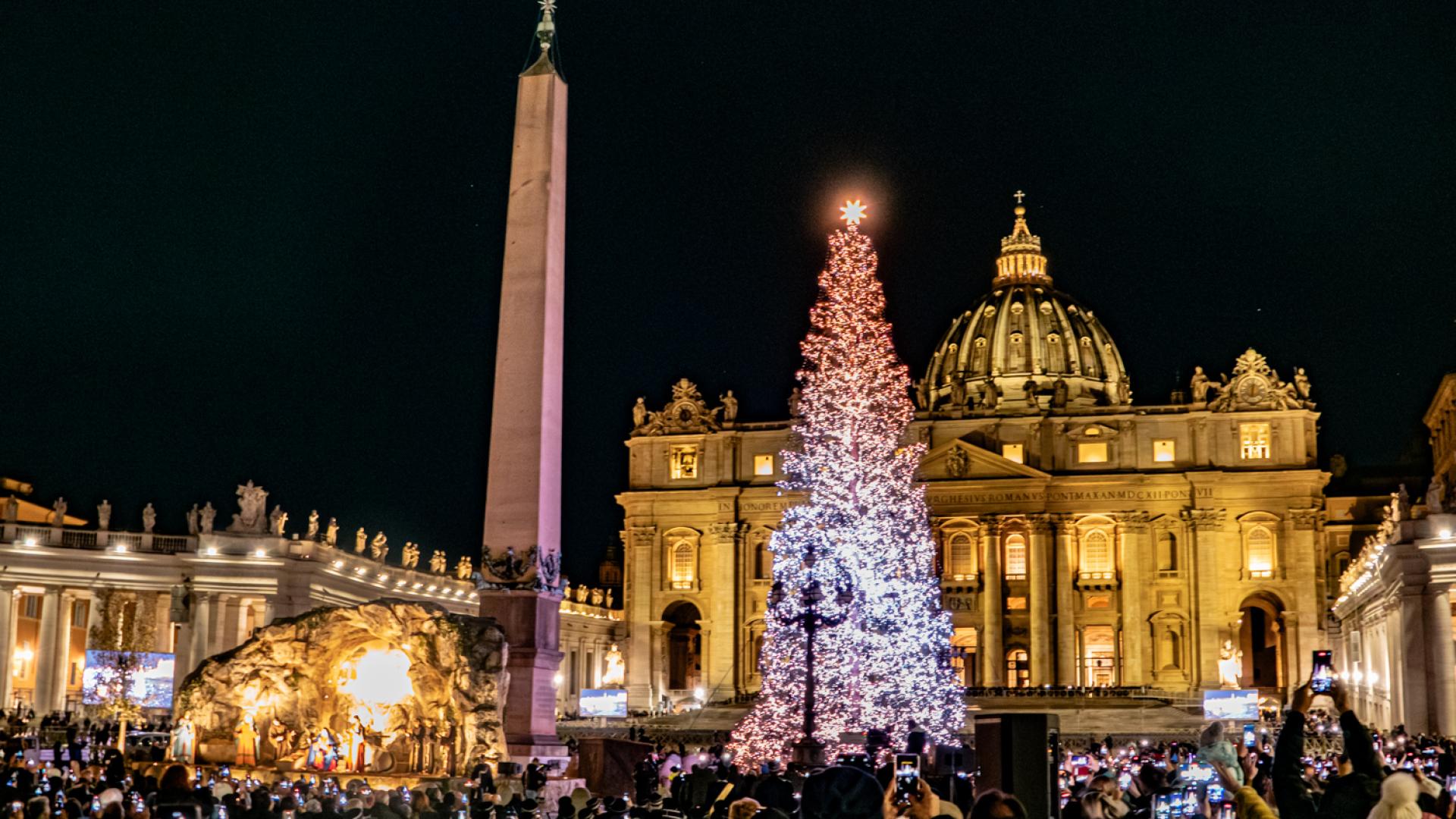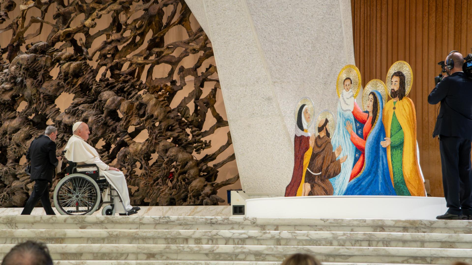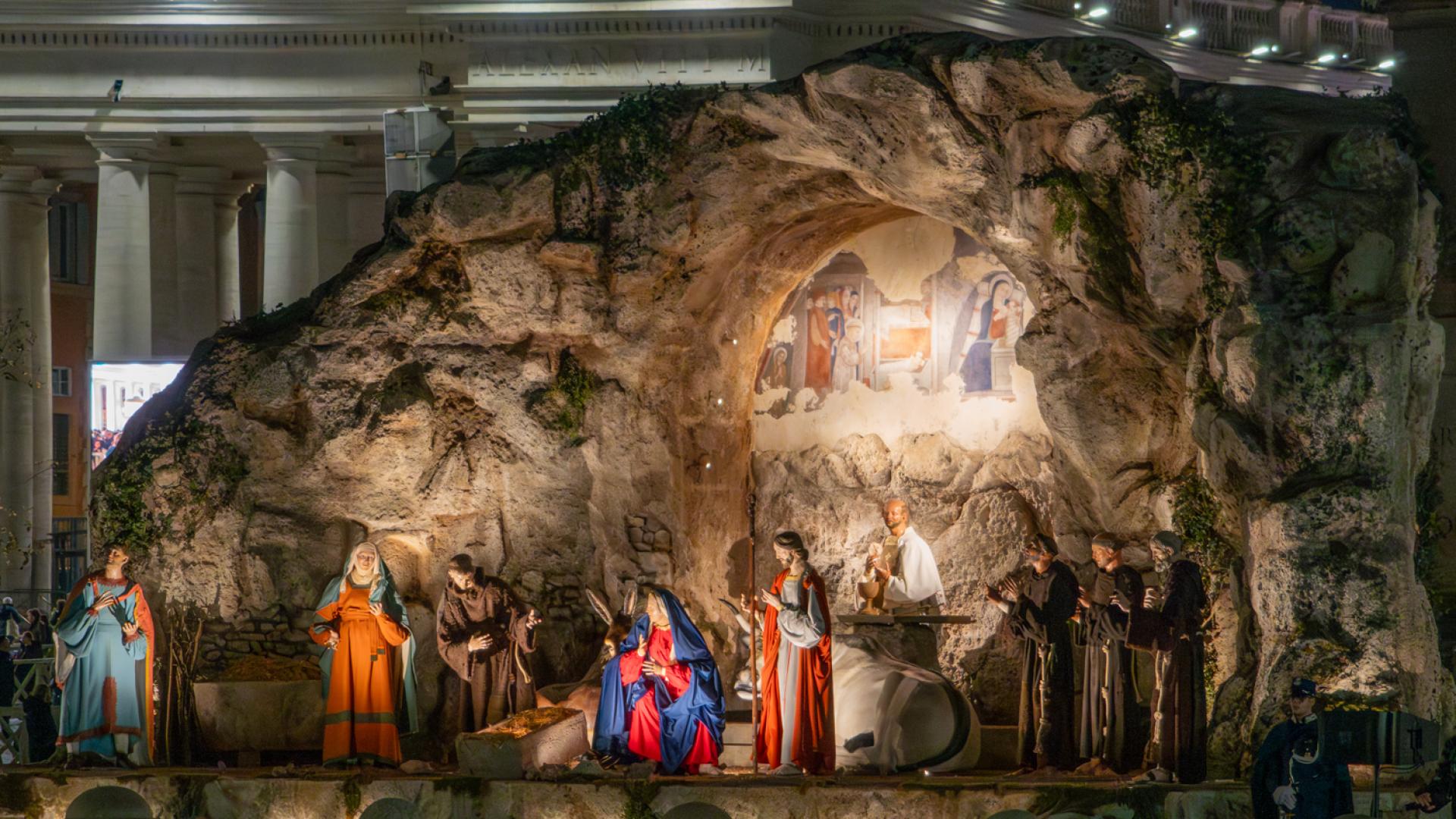 Rivolgendosi alla delegazione di Rieti (provincia della città di Greccio), Papa Francesco ha detto: “Il presepe allestito in Piazza San Pietro si propone di rievocare, dopo ottocento anni, il clima natalizio dell’anno 1223 nella Valle Reatina, dove San Francesco sostò. […] Quest’anno, dunque, da Piazza San Pietro penseremo a Greccio, che a sua volta ci rimanda a Betlemme. E mentre contempliamo Gesù, Dio fatto uomo, piccolo, povero, inerme, non possiamo non pensare al dramma che stanno vivendo gli abitanti della Terra Santa, manifestando a questi nostri fratelli e sorelle, specialmente ai bambini e ai loro genitori, la nostra vicinanza e il nostro sostegno spirituale. Davanti ad ogni presepe, anche a quelli realizzati nelle nostre case, noi riviviamo ciò che è avvenuto a Betlemme più di duemila anni fa; e questo dovrebbe risvegliare in noi la nostalgia del silenzio e della preghiera, nella nostra vita quotidiana spesso tanto frenetica. Silenzio, per poter ascoltare quello che Gesù ci dice da quella “cattedra” singolare che è la mangiatoia. Preghiera, per esprimere lo stupore riconoscente, la tenerezza, magari le lacrime che la scena della Natività suscita in noi. E in tutto questo ci è di modello Maria: lei non dice nulla, ma contempla e adora”.