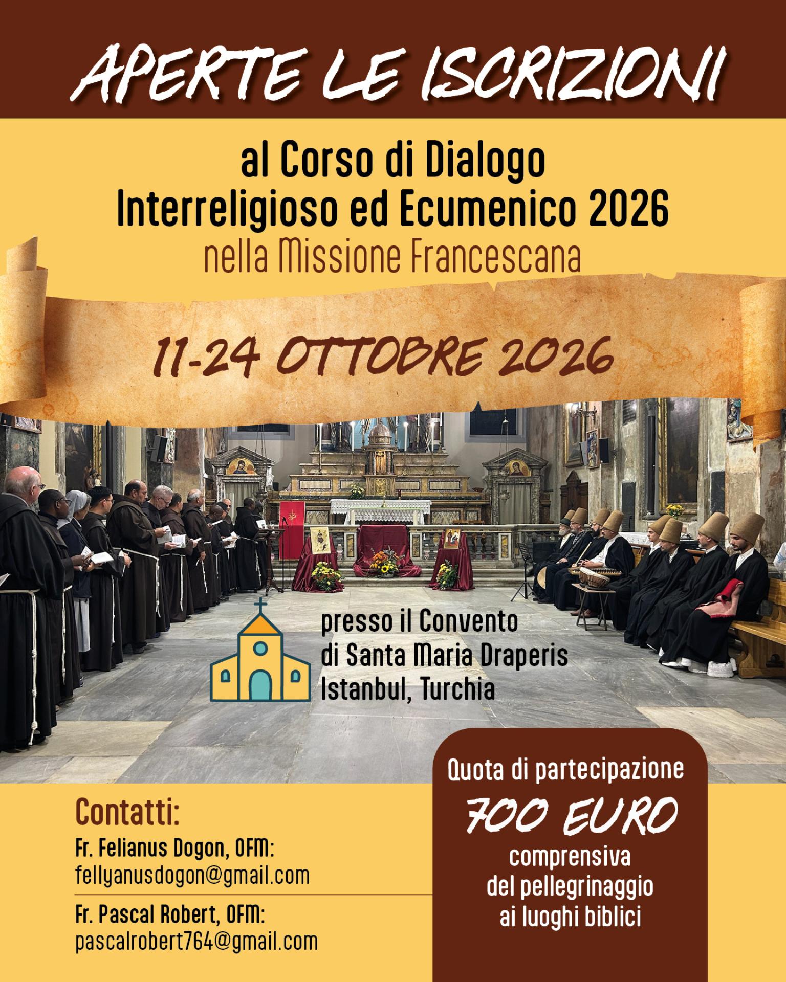 Siamo lieti di invitarvi a partecipare al Corso Annuale di Dialogo Interreligioso ed Ecumenico 2026, organizzato dalla Comunità Internazionale per il Dialogo Interreligioso ed Ecumenico, che si terrà a Istanbul, in Turchia, dall’11 al 24 ottobre 2026, presso il Convento OFM di Santa Maria Draperis.