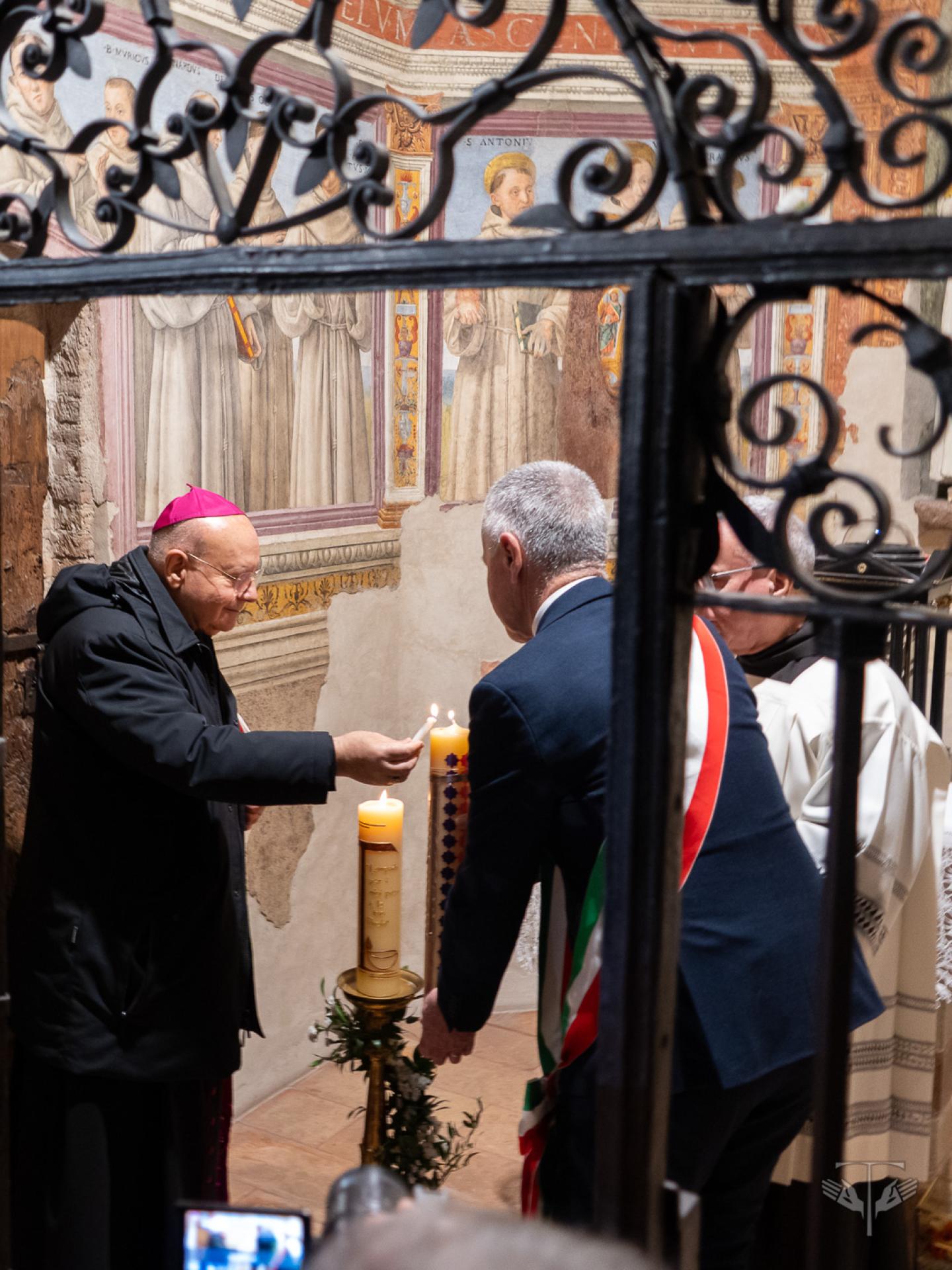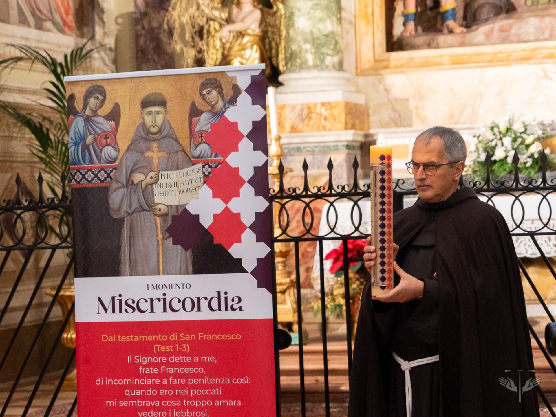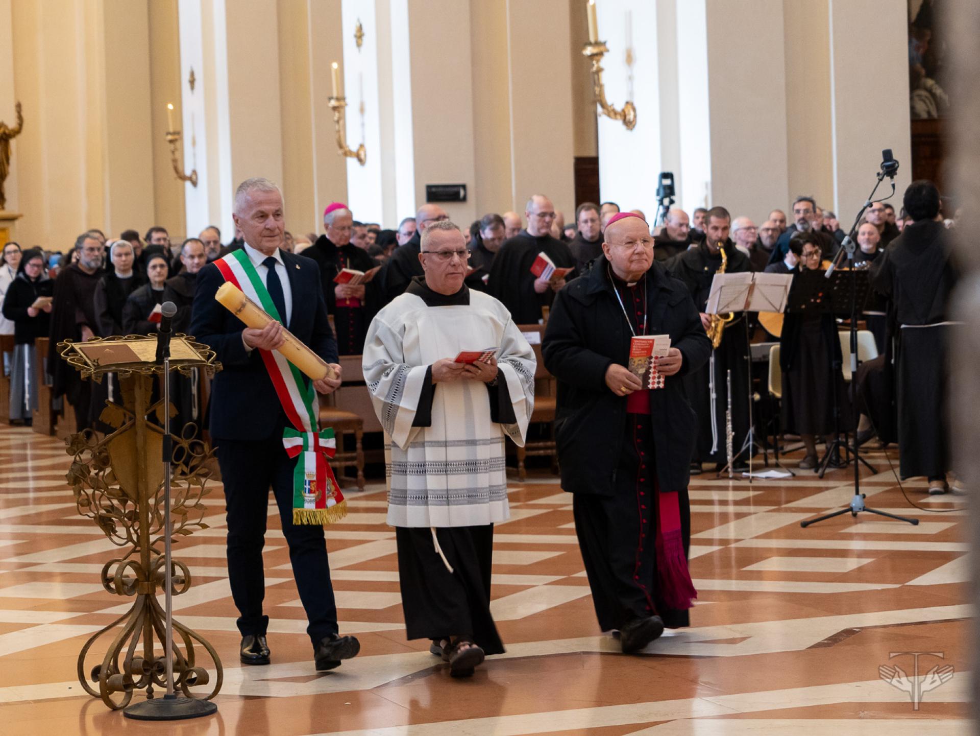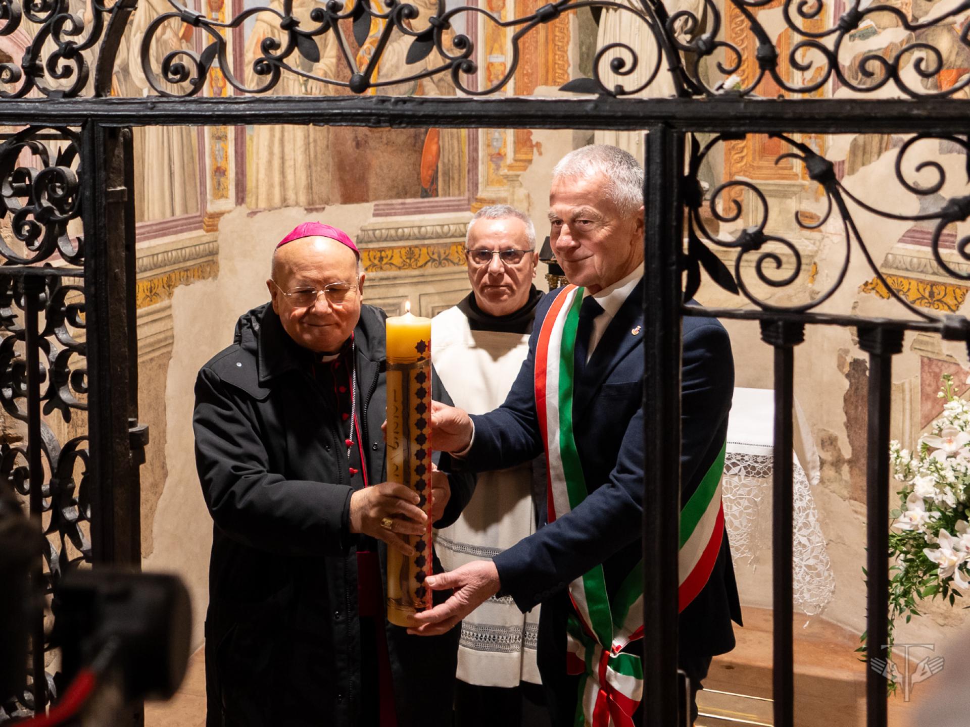 Il rito di apertura è iniziato con un gesto concepito come ponte simbolico e spirituale tra il Centenario della composizione del Cantico delle Creature (2025) e il Centenario del Transito (2026). Riprendendo le ultime due strofe del Cantico (quelle dedicate alla riconciliazione e a sorella morte corporale), in memoria della riconciliazione tra il vescovo e il Podestà di Assisi, il Vescovo di Assisi-Nocera Umbra-Gualdo Tadino e Foligno, Mons. Domenico Sorrentino, e il Sindaco della città di Assisi, Valter Stoppini, sono entrati nella Basilica portando un cero spento, segno dell’umanità segnata dal conflitto e dalla fragilità.