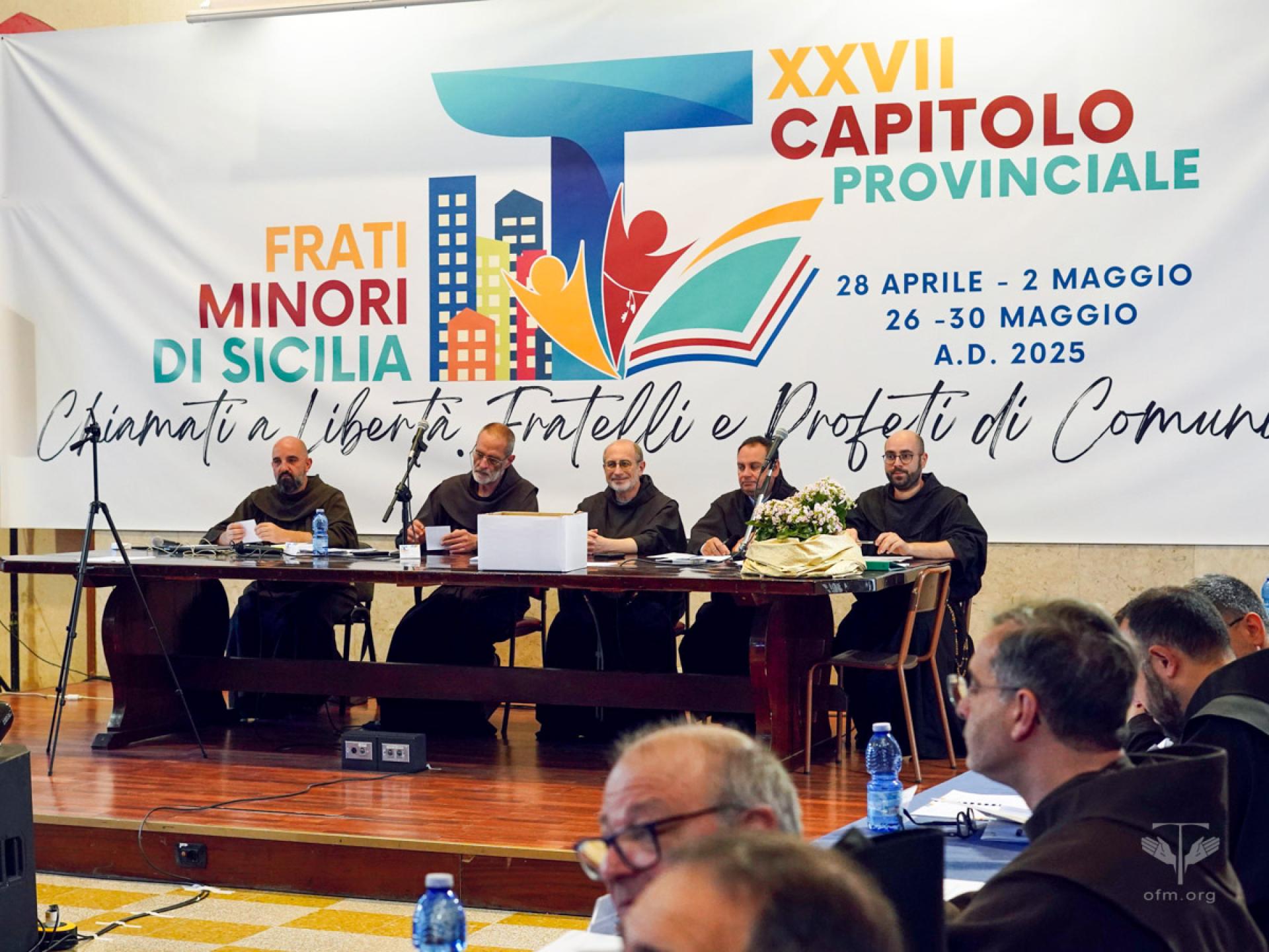 Dal 28 aprile al 2 maggio e dal 26 al 30 maggio 2025, i frati minori della Provincia del SS. Nome di Gesù di Sicilia (Italia) si sono radunati presso la “casa di spiritualità S. Giovanni Battista” in Palermo per celebrare il XXVII Capitolo provinciale, dal tema «Chiamati a libertà. Fratelli e Profeti di comunione», sotto la presidenza del Visitatore generale, Fr. Luca Pozzi.