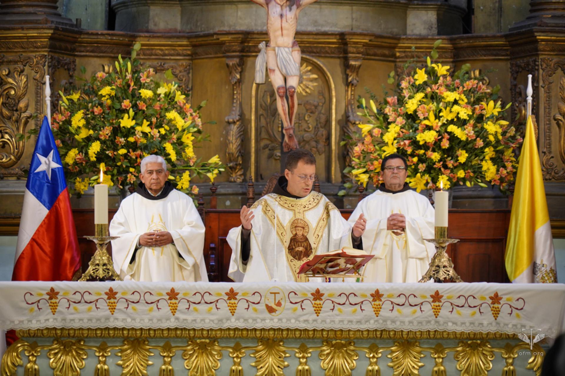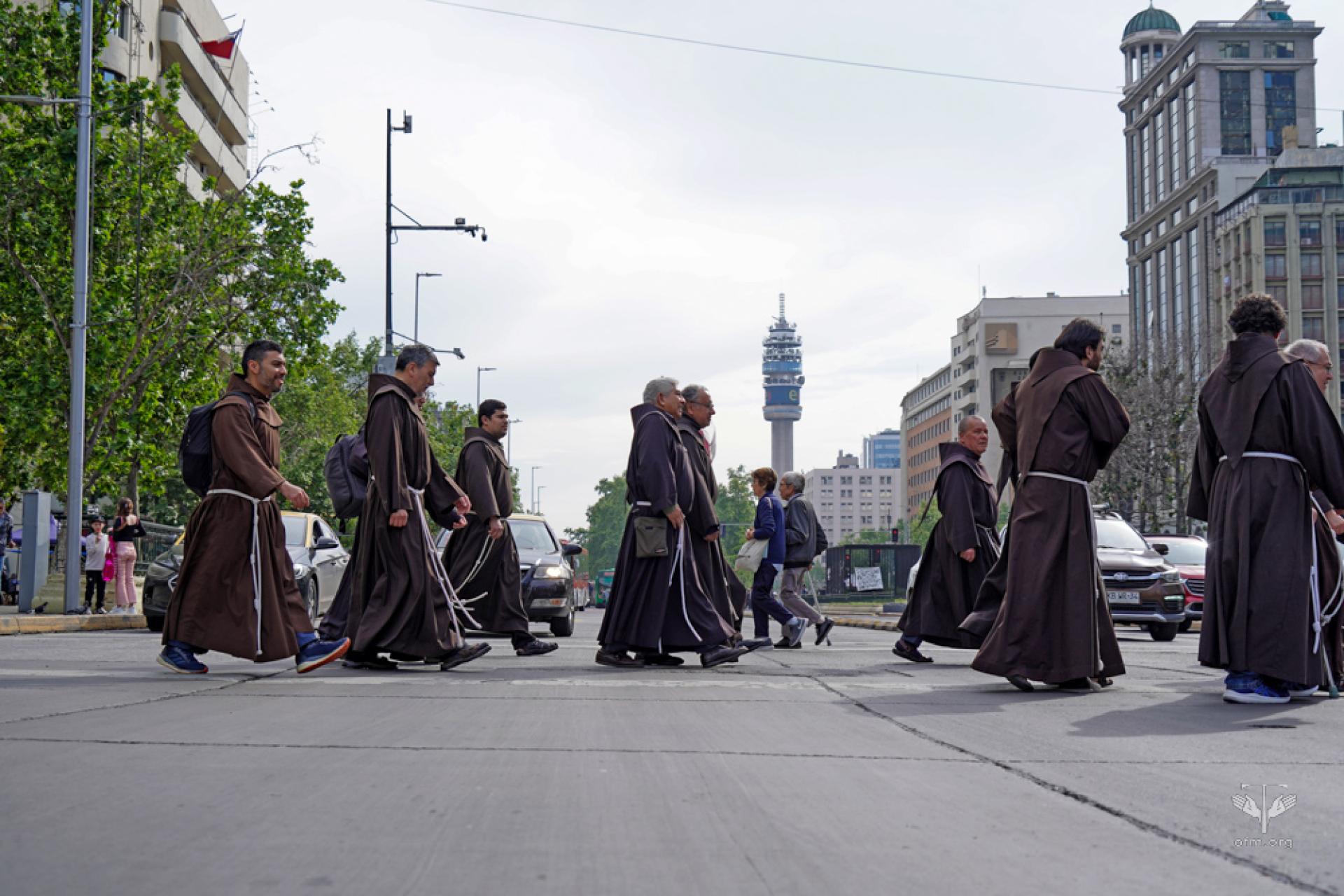 Nell’ultimo giorno del Capitolo, i frati si sono spostati nella città di Santiago per compiere un pellegrinaggio dalla Chiesa e Convento di San Francisco de Asís de la Alameda (sede della Curia provinciale e presenza francescana più antica) alla Chiesa e Convento della Recoleta francescana, dove riposano le spoglie mortali del Venerabile Fra Andresito, testimone credibile del francescanesimo in Cile. In due o tre, i frati camminavano semplicemente tra e con la gente che in quel momento attraversava una delle strade più trafficate di Santiago. L’Eucaristia è stata celebrata nella Recoleta francescana, presieduta da Fr. César Külkamp.