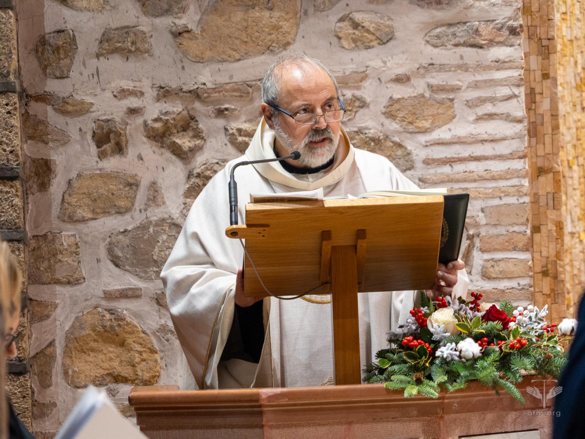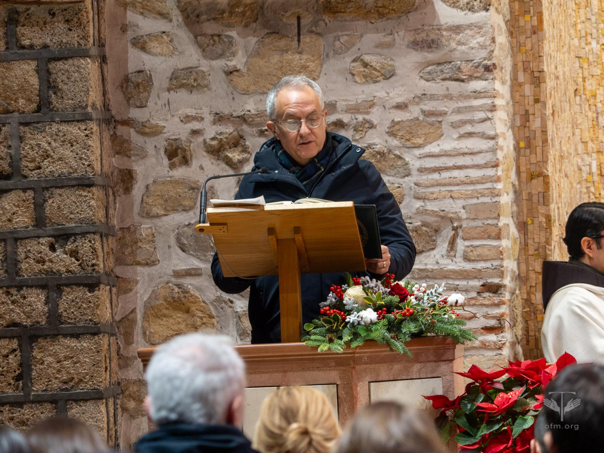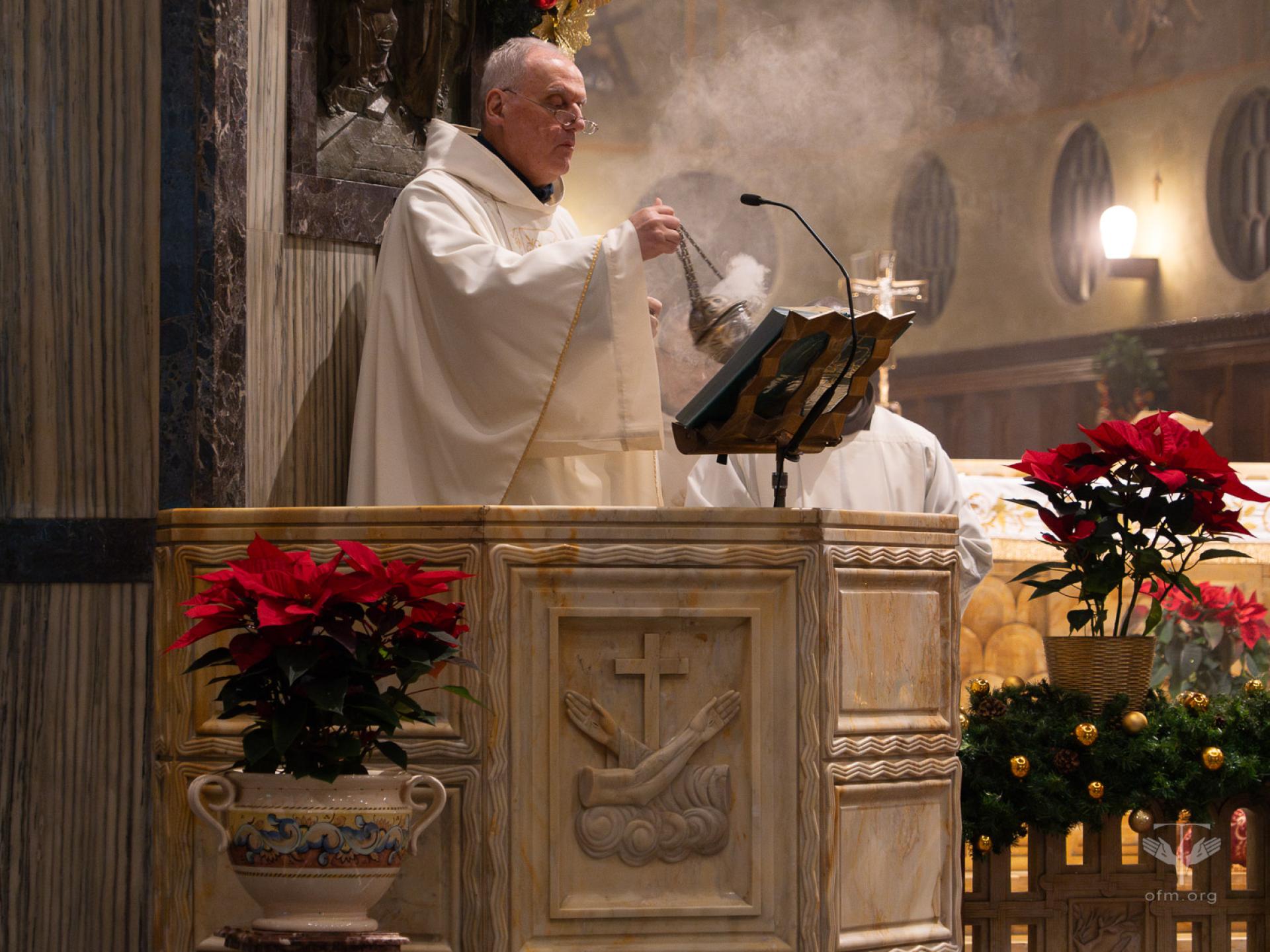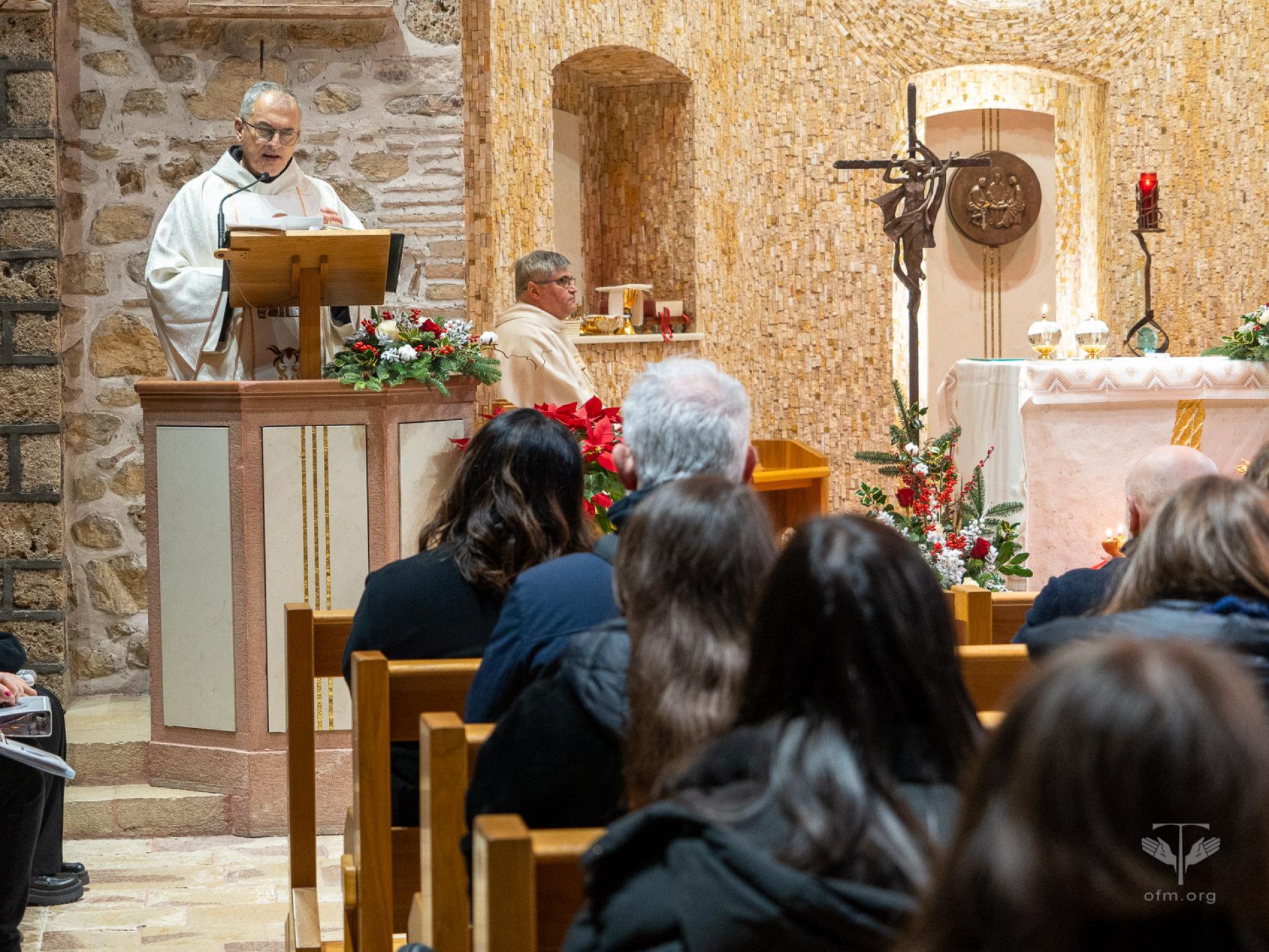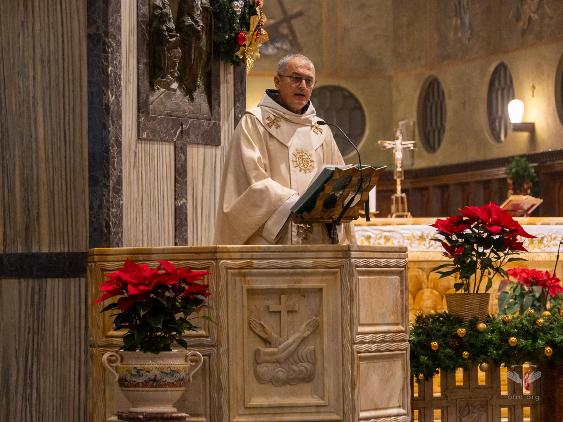 Il giorno seguente il Ministro ha celebrato la Messa di Natale a Greccio insieme a Fr. Luciano de Giusti, Ministro provinciale della Provincia di San Bonaventura e alla comunità locale. Durante l'omelia ha sottolineato che Dio si rivela nell'umanità di Gesù, soprattutto nella sua fragilità, povertà e umiltà. Ha poi aggiunto che la luce di Dio non elimina le tenebre, ma brilla in mezzo ad esse, invitando a cercarlo nelle contraddizioni e nelle difficoltà della vita, anche in tempi di guerra e di sofferenza. Ha poi ricordato che l'esempio di San Francesco a Greccio evidenzia il riconoscimento di un Dio presente nella creazione e nell'umanità. “Celebrare ancora il Natale a Greccio ci riporta a questo sguardo stupito di Francesco. E alimenta, anzi fa divampare la fiamma della nostra fede” ha detto. Inoltre, ha invitato a passare attraverso le nostre oscurità confidando che la luce divina è sempre presente anche nei tempi più difficili.