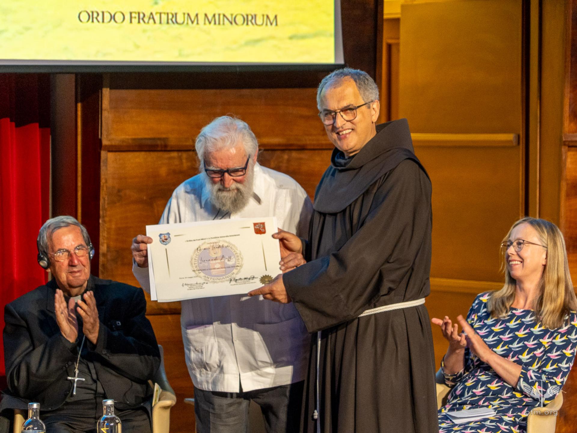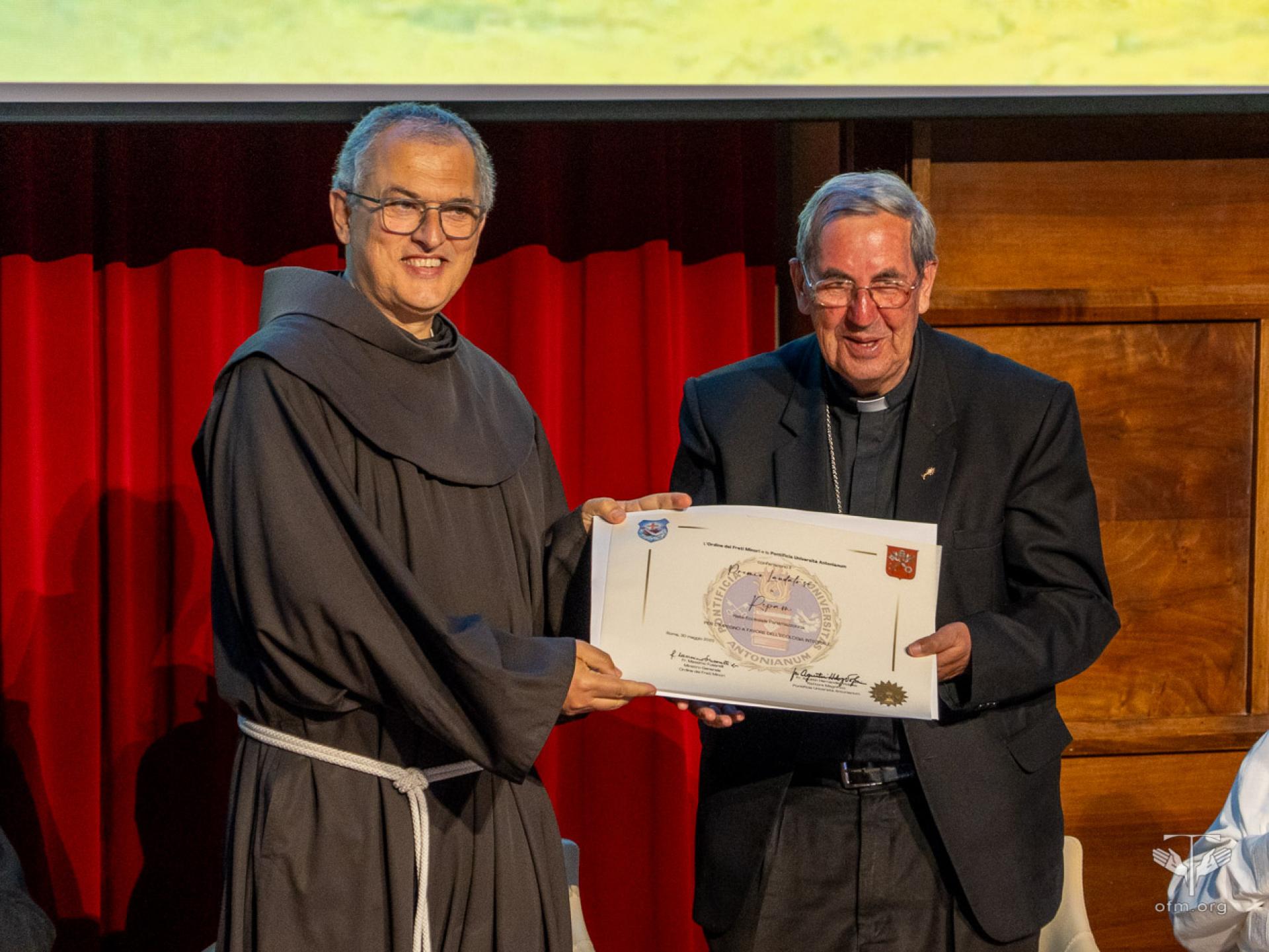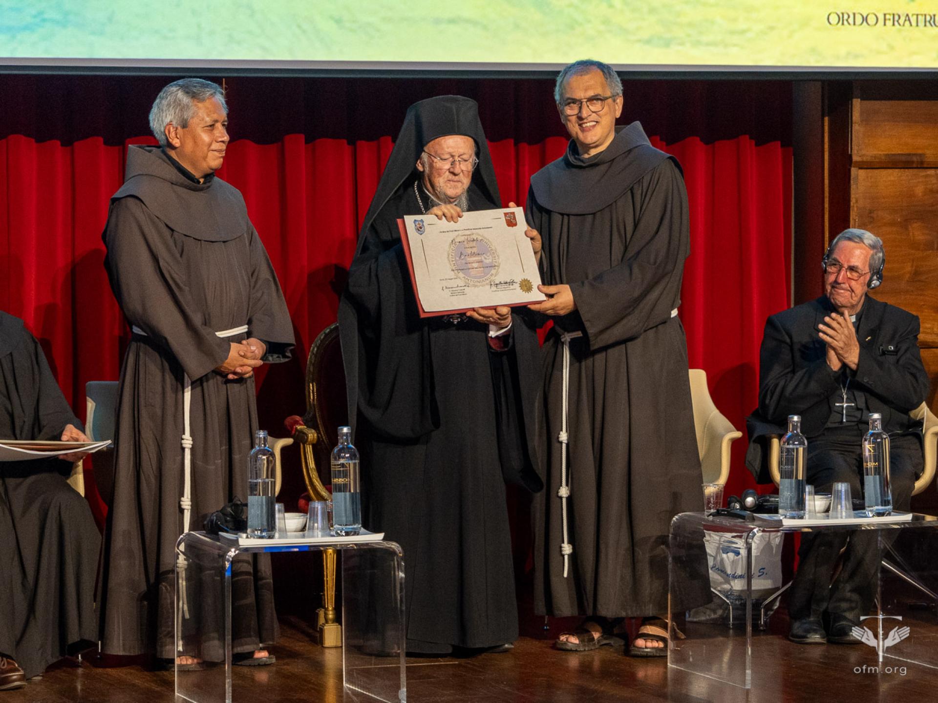 Venerdì 30 maggio l’Ordine dei Frati Minori e la PUA, nella persona di Fr. Massimo Fusarelli, Ministro generale dell’OFM e Gran Cancelliere della PUA, hanno conferito un riconoscimento a persone e istituzioni che si sono distinte per il loro impegno a favore dell’ecologia integrale. Si tratta del Patriarca Bartolomeo I, Leonardo Boff, la Rete Ecclesiale Panamazzonica, il Movimento Laudato Si’. “Cari premiati, voi non ricevete oggi solo un riconoscimento, ma se mi permettete di dire, avete una responsabilità ancora maggiore: continuare ad essere una voce profetica, in un mondo che spesso, troppo spesso, preferisce il profitto al bene comune. A tutti voi rivolgo allora questo invito finale: tornate per favore alle vostre comunità, portando con voi il seme della conversione ecologica integrale. Che il Cantico delle Creature risuoni nelle nostre case, che la Laudato si' ispiri le nostre scelte quotidiane, anche piccole. Il futuro della terra, dono di Dio, è anche nelle nostre mani, ma soprattutto nei nostri cuori”, ha detto Fr. Massimo al termine della consegna dei premi.