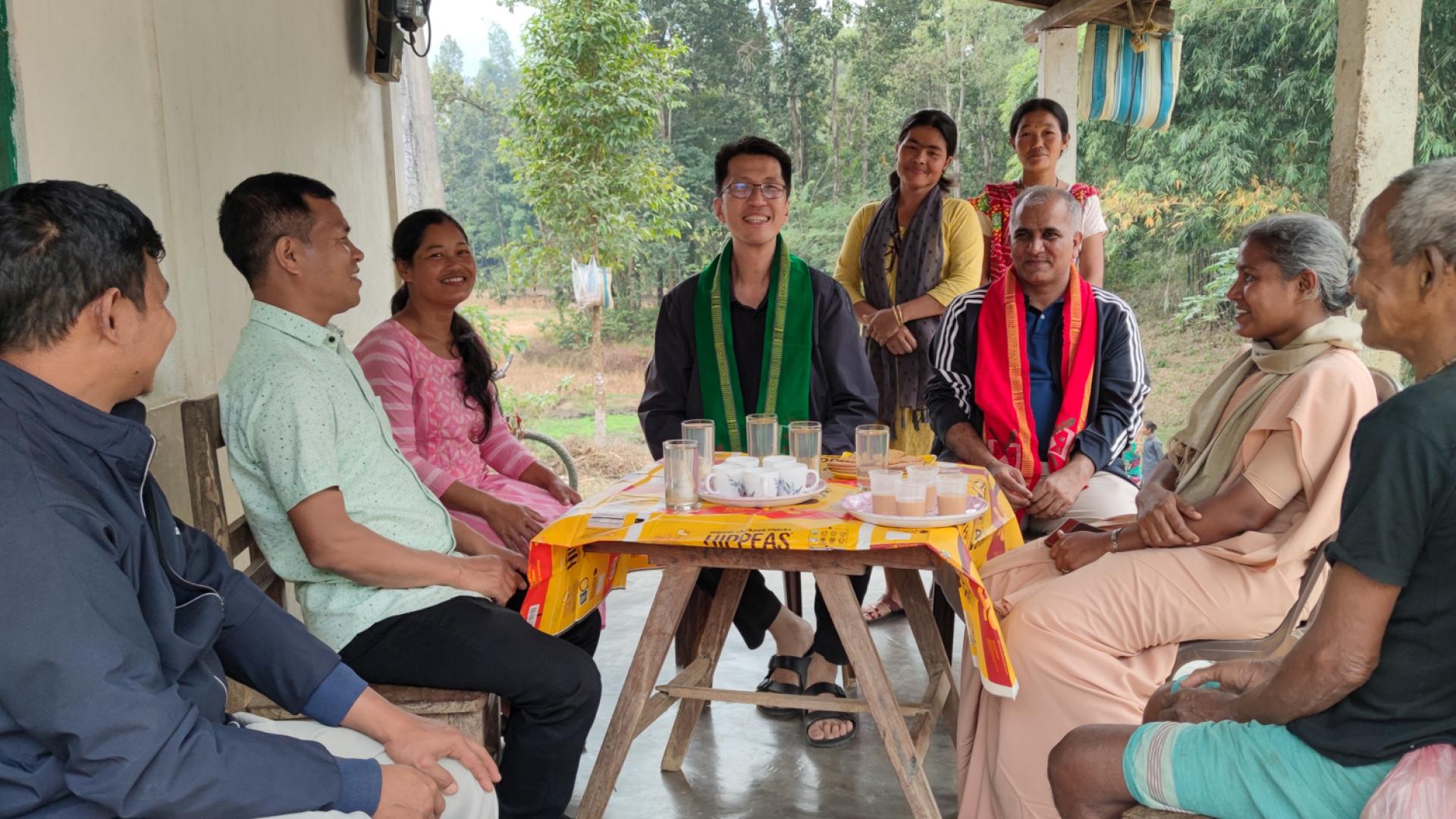 4. General Definitor and Provincial Minister (centre, wearing traditional scarves) with leaders and catechists of Gharo village, 7/12/23, Salbari (Assam State).