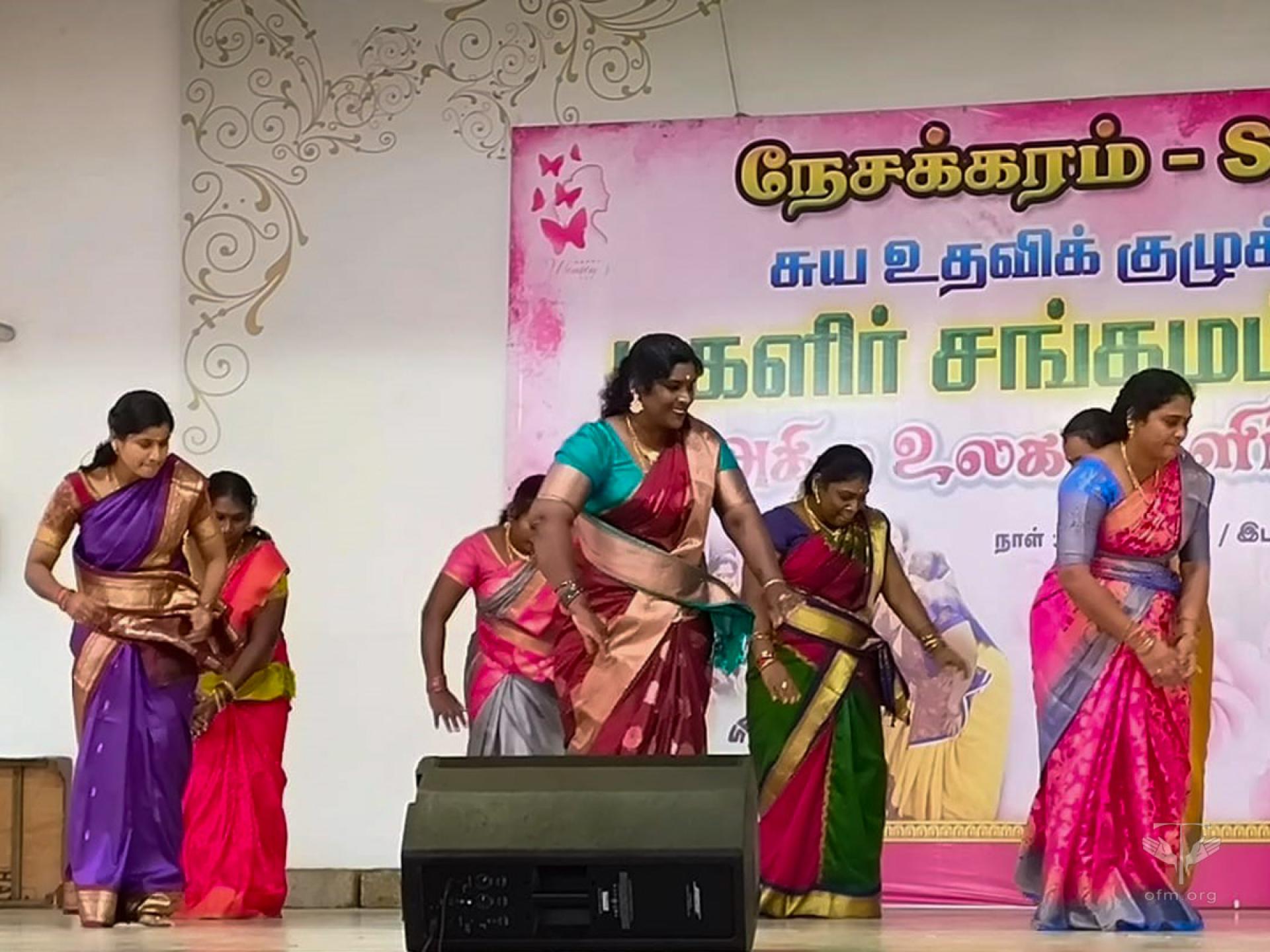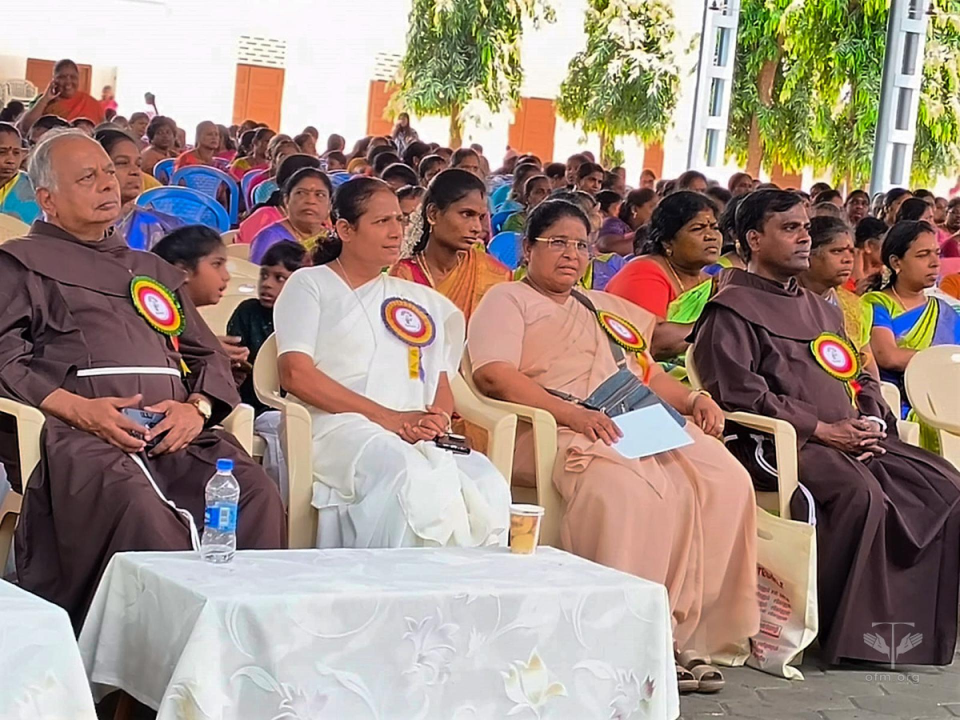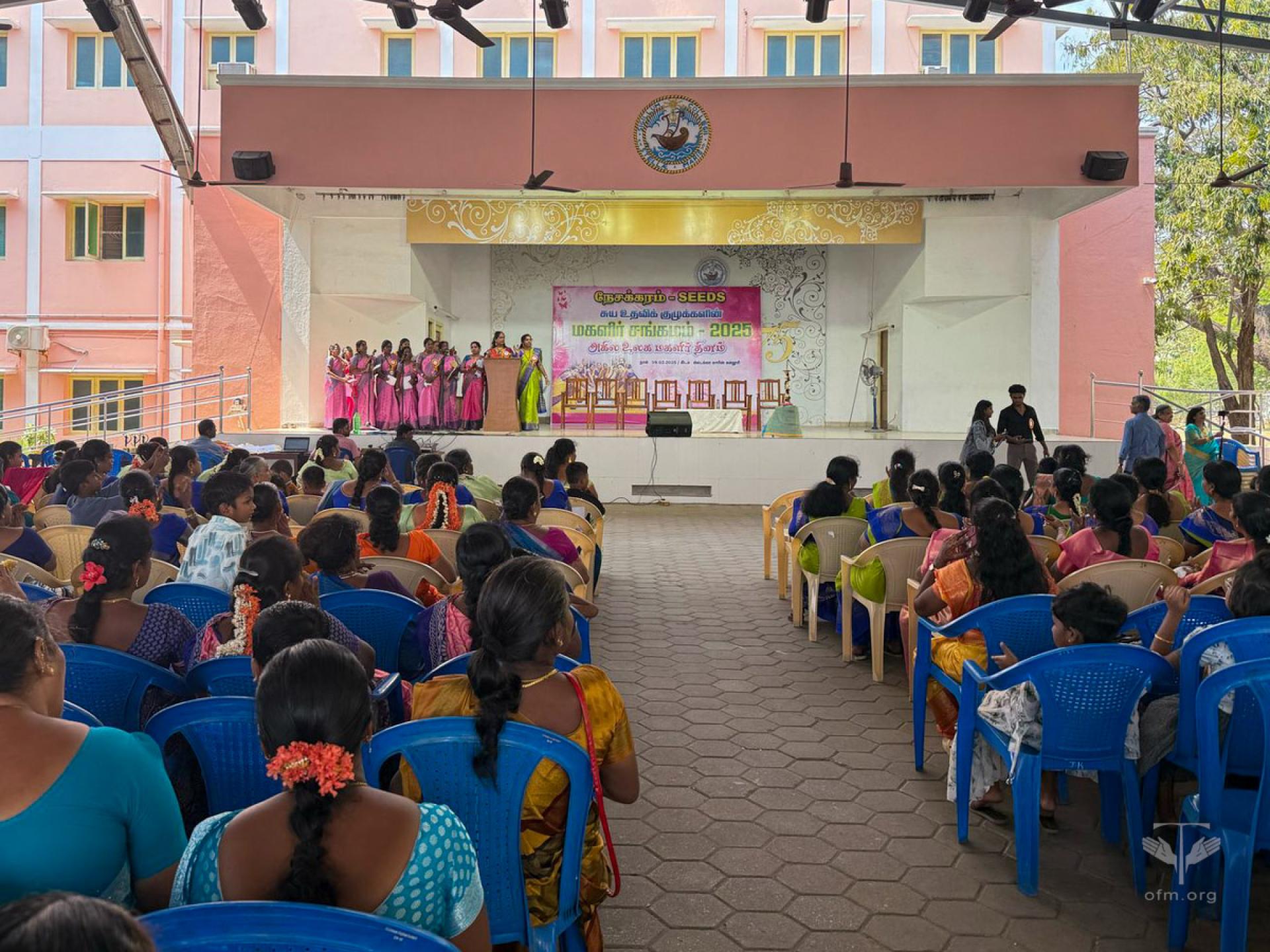Once every two years, preferably on Women’s Day (8th March) or another convenient day, all the women are organized to celebrate the Women’s Mela, called Magalir Sangamam. Accordingly, Nesakkaram invited the women from 118 SHGs to celebrate it on the 9th of March at Stella Maris College. The stage and the open auditorium were well prepared for the event. A total of 1,290 women gathered, dressed in the colorful uniform sarees of their respective groups.The chief guests – Br. Xavier Durairaj Minister Provincial of St. Thomas the Apostle Province, India; Mrs. Aadhi Lakshmi Logamurthy, Advocate from the Madras High Court; Sr. Usha Rani, FMM, Superior of Stella Maris Convent; and others—were given a warm welcome and honored by the women’s groups.