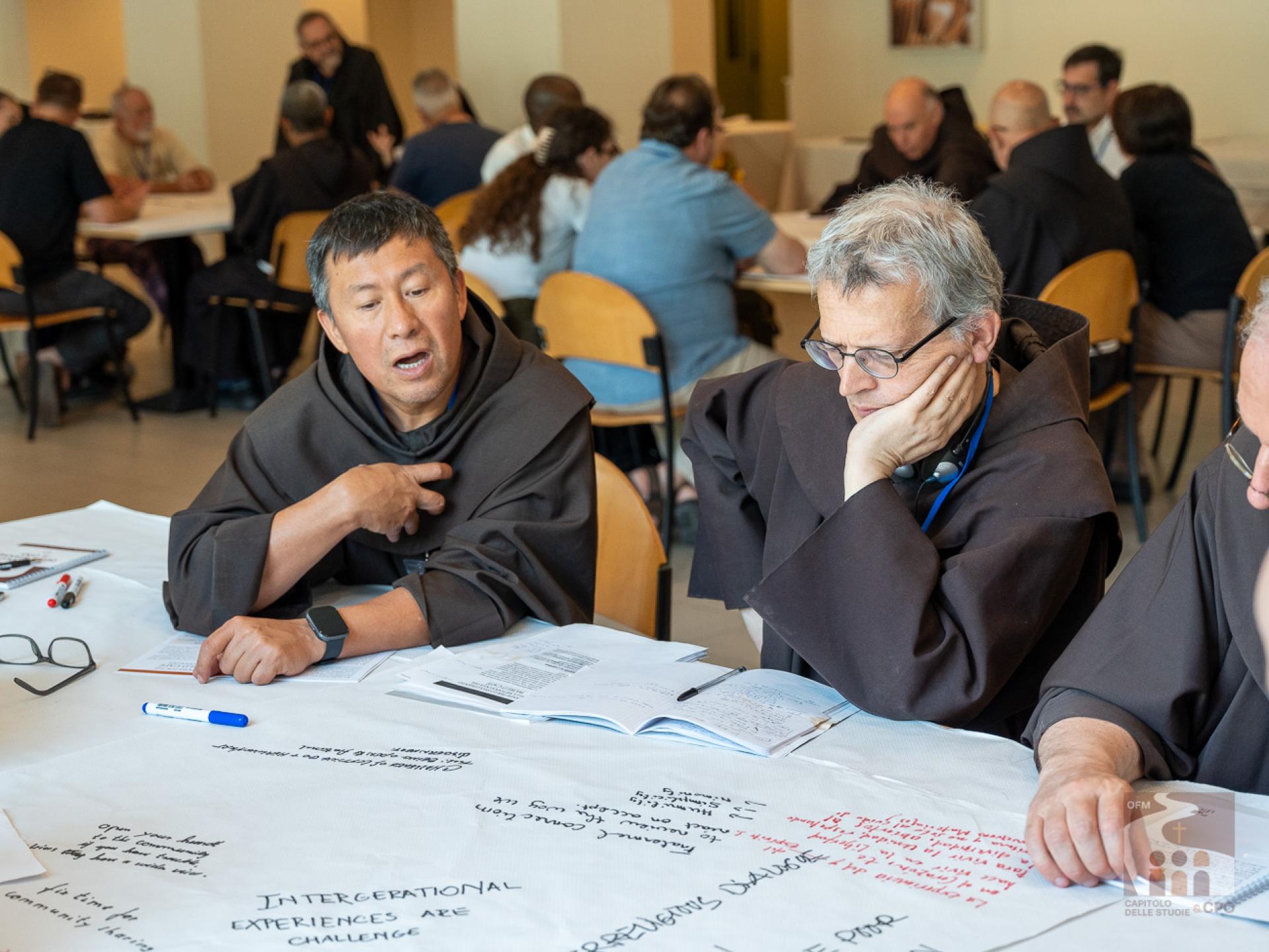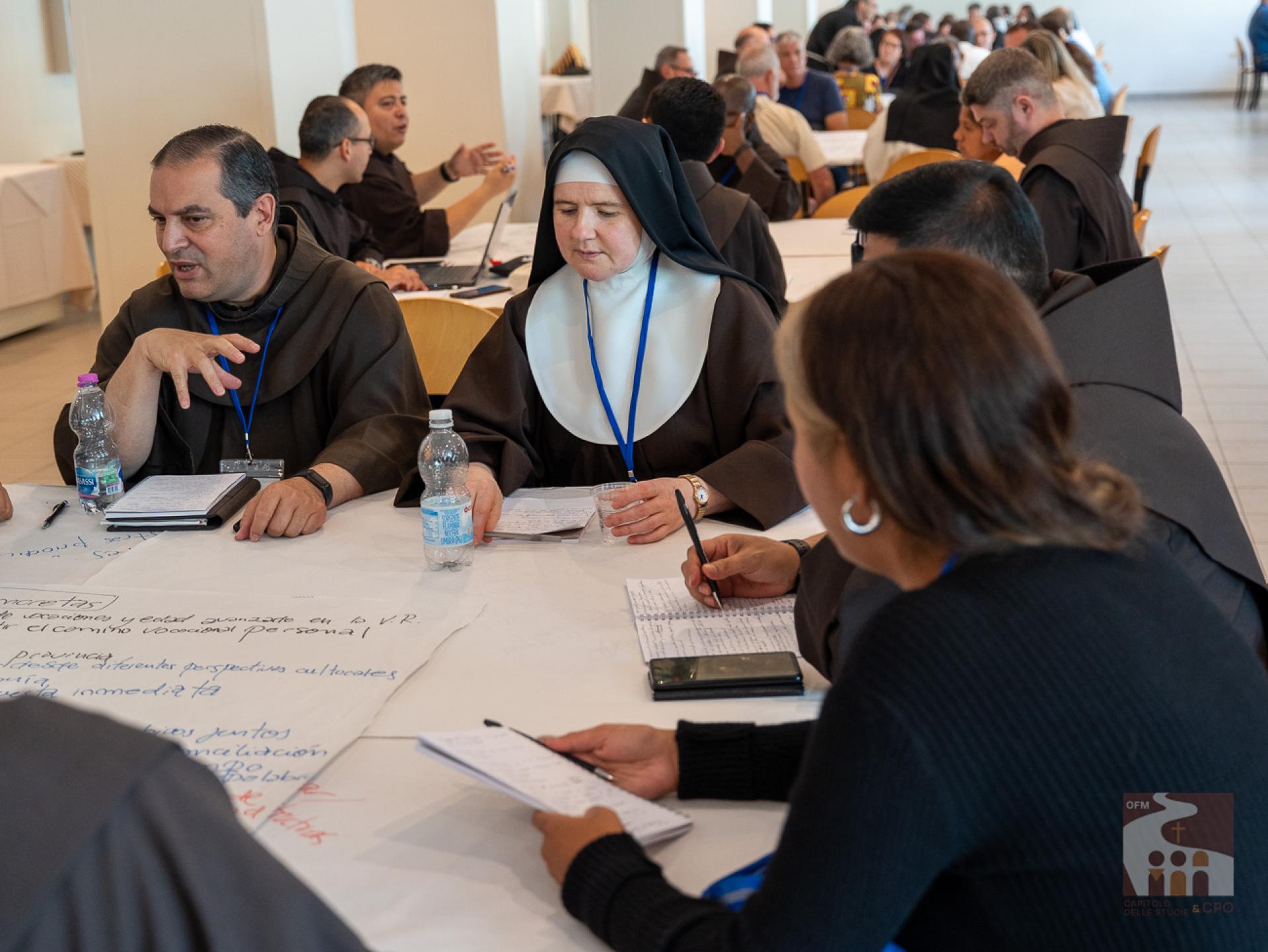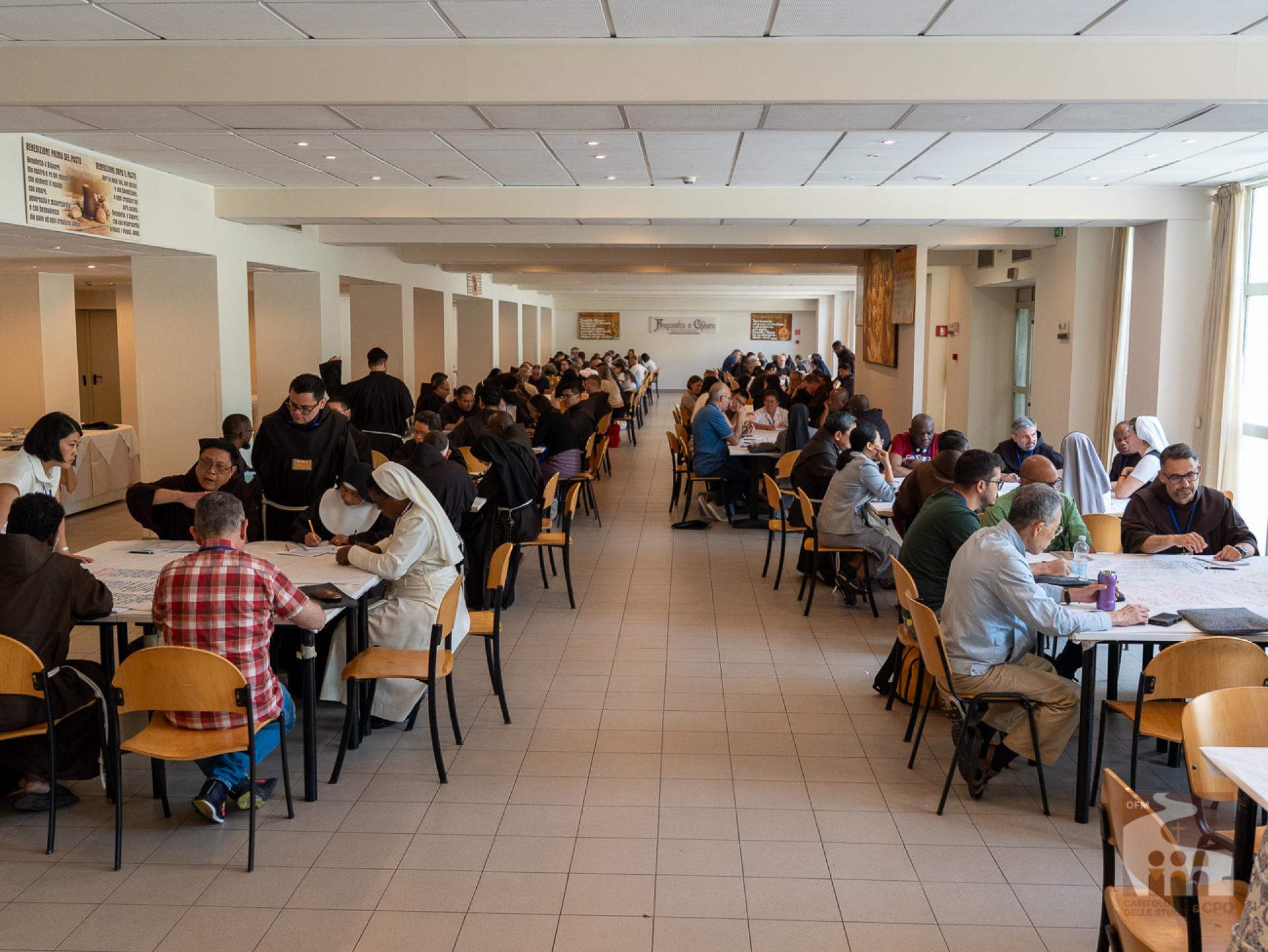 The participants then began the working methodology of the “World Café”: they were divided in rotation into 18 international tables, that is, not by language and always changing the interlocutors, and they answered the 3 questions expressed in the Instrumentum Laboris on the Charism (page 19). The works were then presented in the assembly end-of-day plenary: the secretaries of the tables presented their responses, implementing them with those of other tables. The results of today and the next two days will then be collected in the Final Document of the Chapter of Mats.A curiosity about the international tables: although the capitulars come from about 50 countries around the world, the diversity of languages was not a problem, both because the secretaries of each table spoke several languages, and because - as Br. Cesare Vaiani, General Definitor, said - "the Spirit of Pentecost helped us".