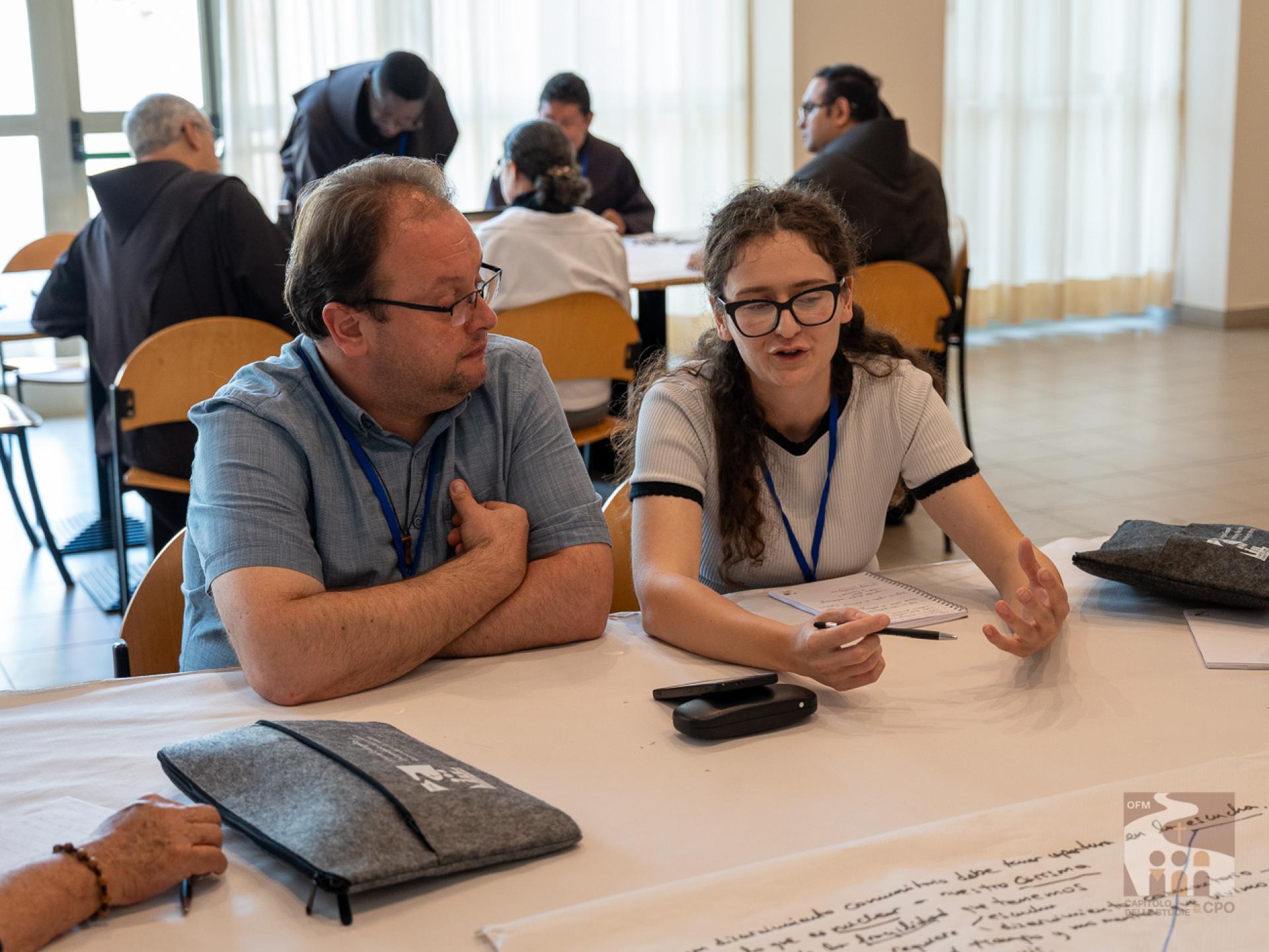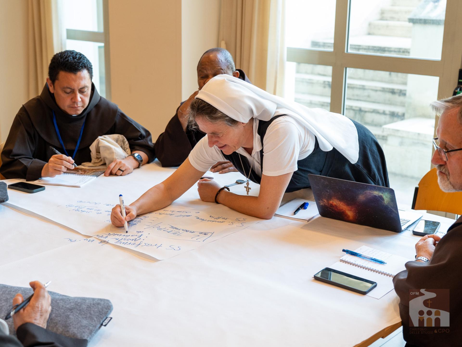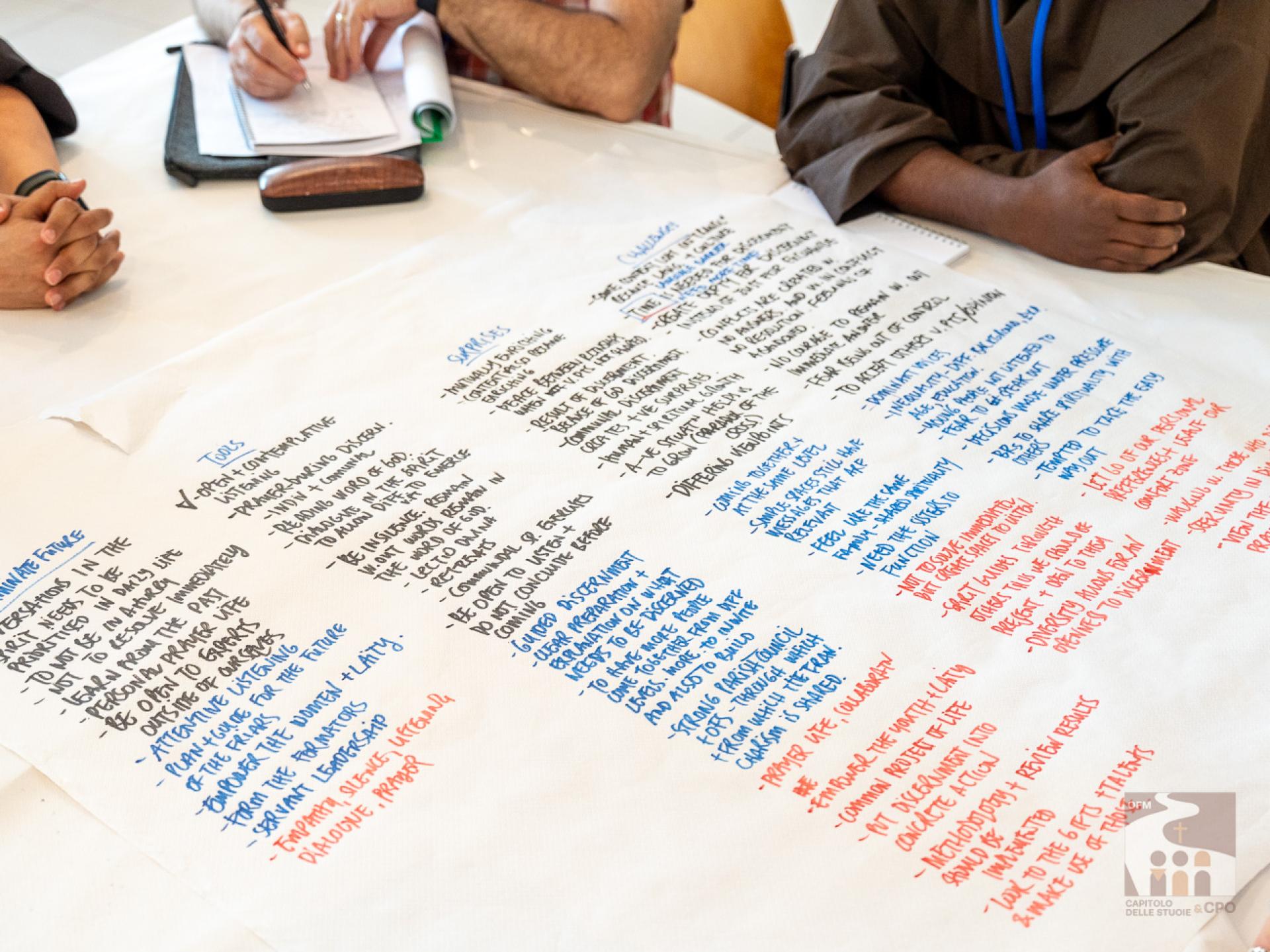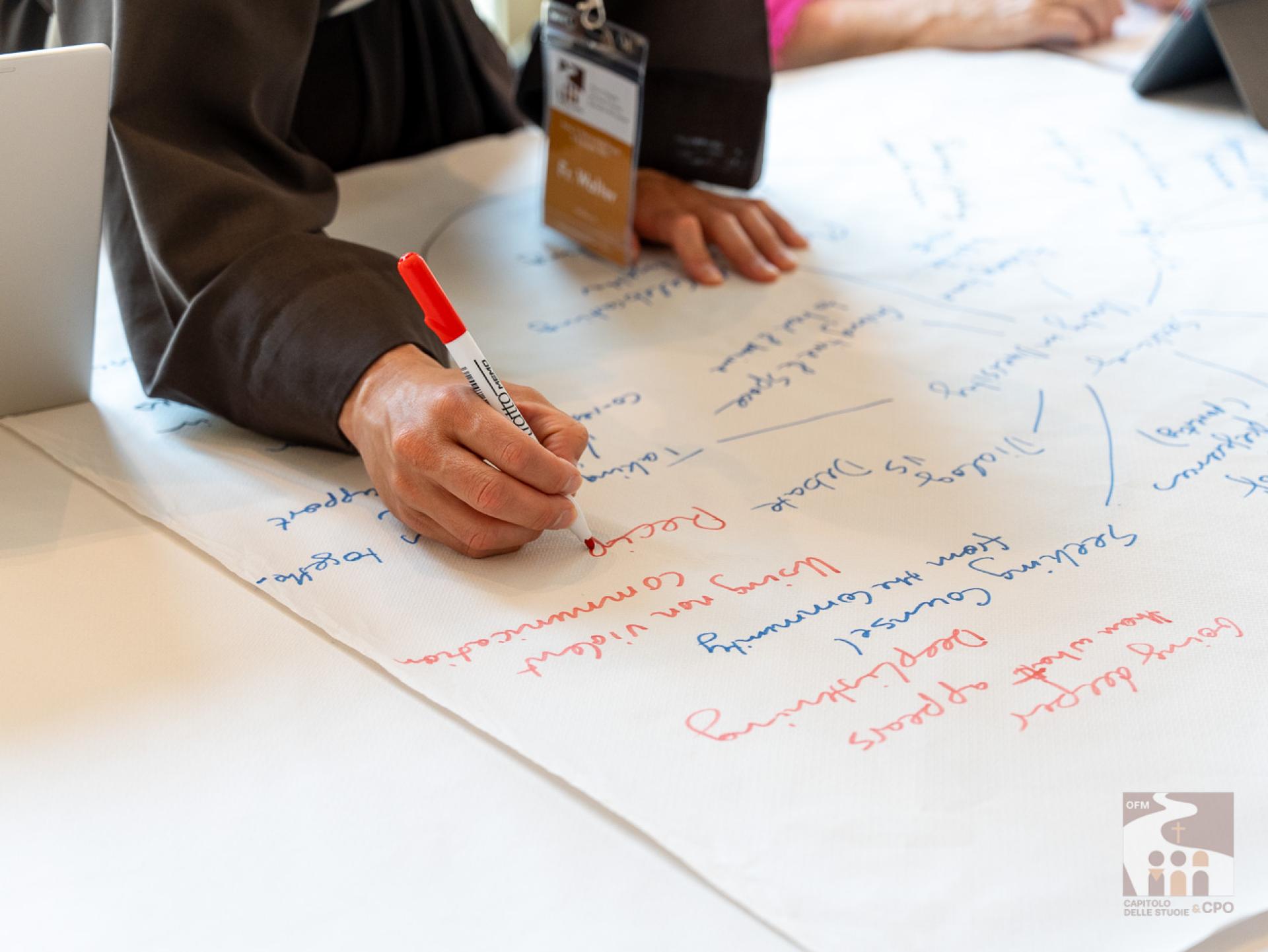 The participants then began the working methodology of the “World Café”: they were divided in rotation into 18 international tables, that is, not by language and always changing the interlocutors, and they answered the 3 questions expressed in the Instrumentum Laboris on the Charism (page 19). The works were then presented in the assembly end-of-day plenary: the secretaries of the tables presented their responses, implementing them with those of other tables. The results of today and the next two days will then be collected in the Final Document of the Chapter of Mats.A curiosity about the international tables: although the capitulars come from about 50 countries around the world, the diversity of languages was not a problem, both because the secretaries of each table spoke several languages, and because - as Br. Cesare Vaiani, General Definitor, said - "the Spirit of Pentecost helped us".