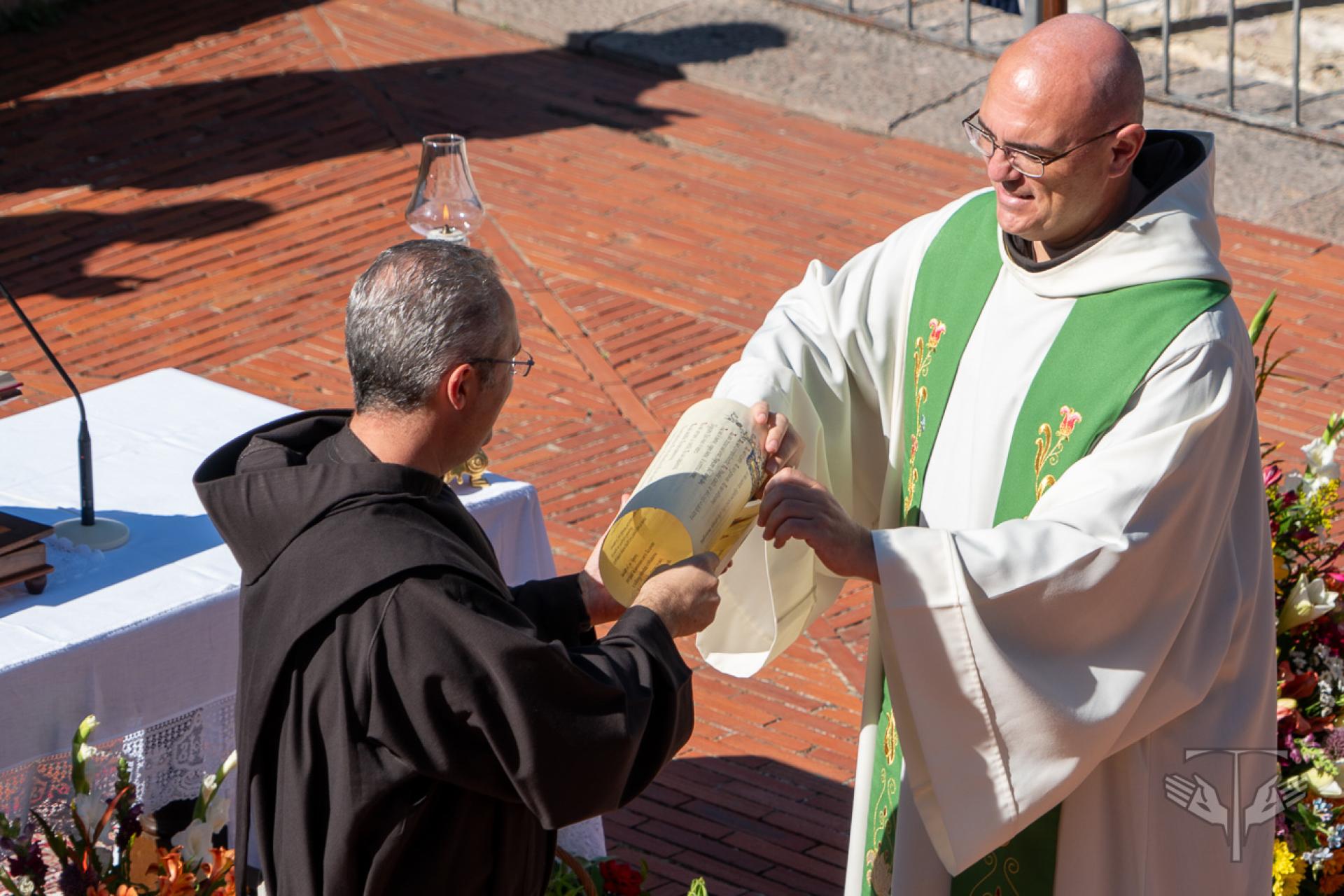 Al termine dell’Eucaristia, si è tenuto idealmente il passaggio di consegne tra il Guardiano di San Damiano, Fr. Mauro Botti, referente del Centenario del Cantico, e il Guardiano della Porziuncola, Fr. Massimo Travascio, referente del Centenario della Pasqua di San Francesco: Fr. Mauro ha consegnato a Fr. Massimo la pergamena contenente il testo delle Lodi a Dio Altissimo e del Cantico delle Creature, che aveva ricevuto a sua volta alla Verna nell’autunno del 2023, al termine del Centenario delle Stimmate.