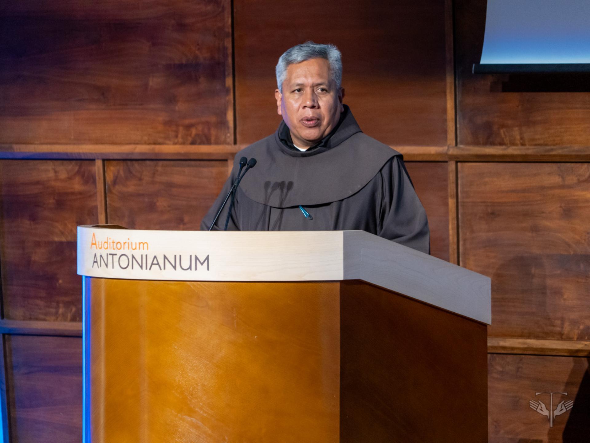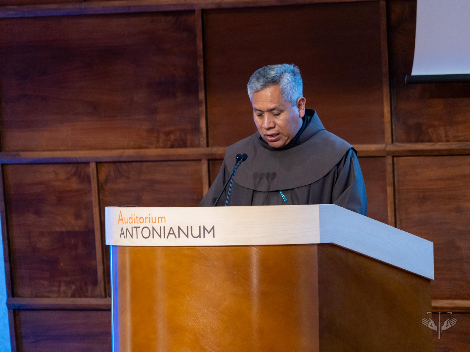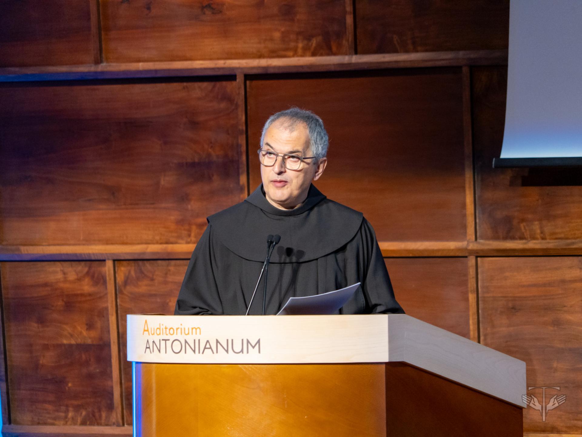 Nel suo saluto iniziale, il Rettore ha ringraziato il Gran Cancelliere, i docenti, il personale amministrativo, gli studenti per il servizio quotidiano che rende possibile la missione dell’Antonianum. Ha inserito l’odierna festa nel cammino dei grandi centenari francescani, ricordando gli anniversari iniziati nel 2019, il progetto dell’Università Francescana, il Patto Educativo Globale voluto da papa Francesco e gli anni segnati dalla pandemia, che hanno chiesto creatività e resilienza nella vita accademica. Presentando alcuni dati, ha sottolineato la crescita della stabilità del corpo docente e lo sviluppo di nuove iniziative, come l’Accademia in Ecologia Integrale, i programmi di alta specializzazione in Intelligenza Artificiale e le numerose collaborazioni inter‑universitarie e accordi di cooperazione, segni di un Ateneo che vuole coniugare ricerca, didattica e “terza missione” a servizio della Chiesa e della società.