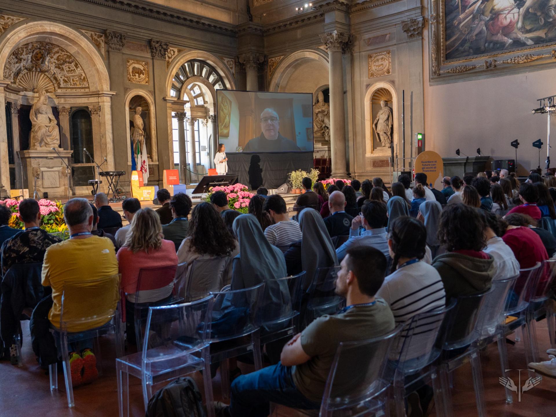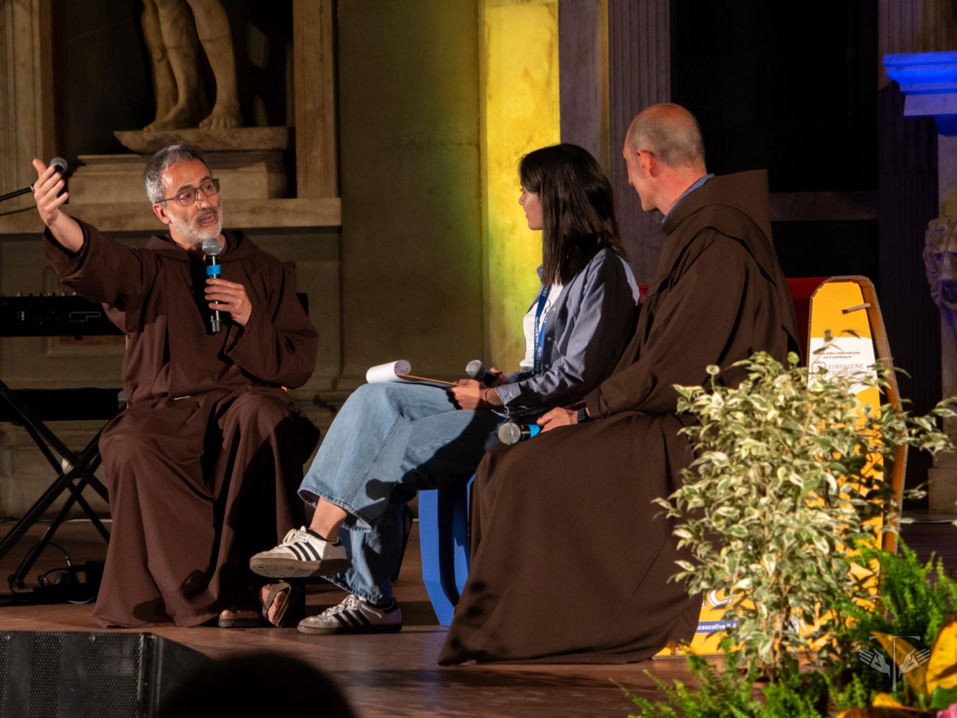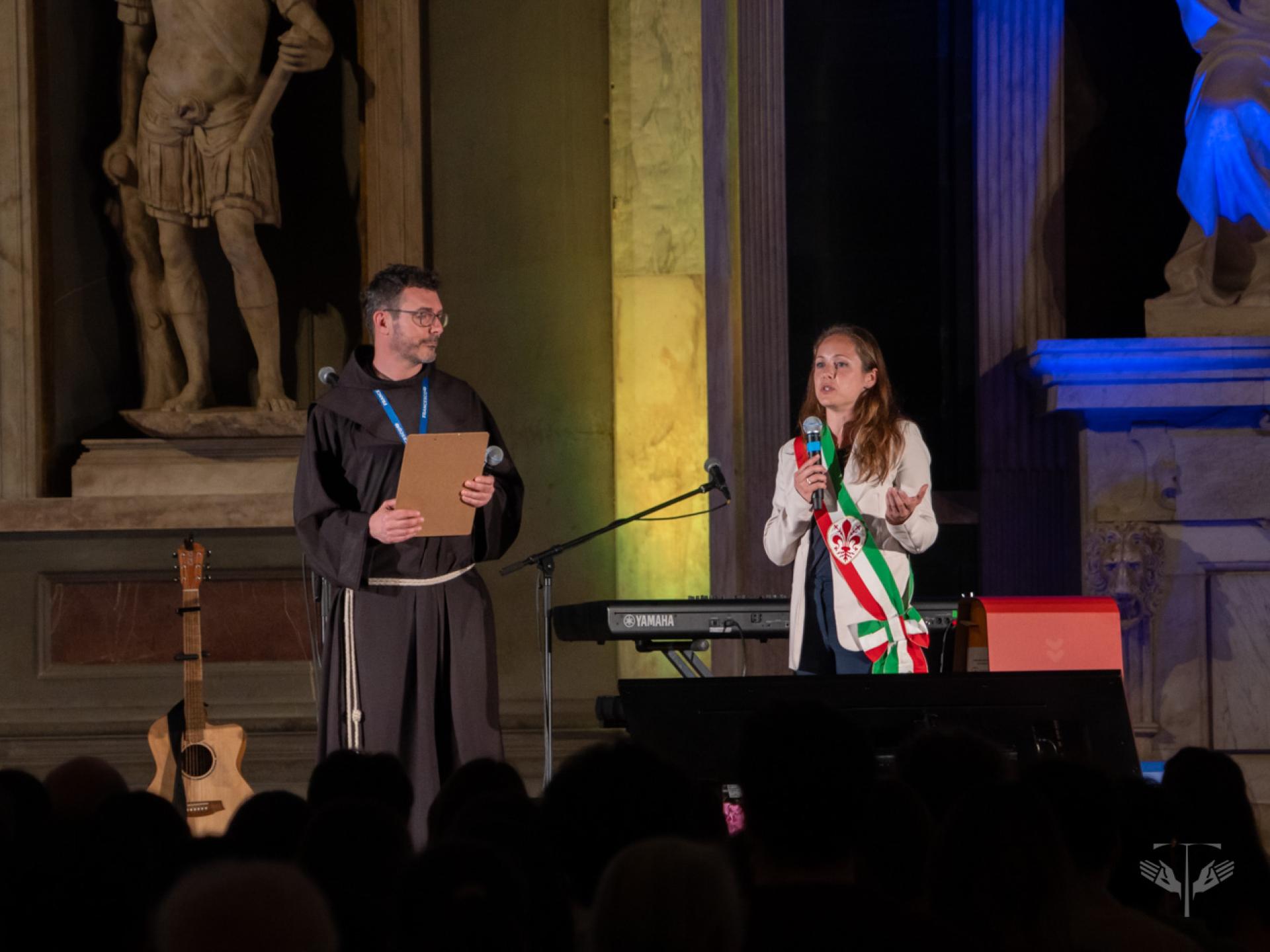 L’avvio del festival, nel Salone dei Cinquecento di Palazzo Vecchio, è stato segnato dall’intervento di Fr. Matteo Brena, OFM, che ha presentato la ricorrenza del centenario come un “transito” che invita a guardare, abitare e attraversare i limiti. A questo orizzonte si sono uniti i saluti istituzionali di Letizia Perini, assessora alle politiche giovanili, ed Eugenio Giani, presidente della Regione Toscana, sottolineando il legame tra la tradizione di pace della regione e l’ispirazione francescana. Nello stesso contesto, la parola di Fr. Roberto Pasolini, OFMCap, predicatore della Casa Pontificia, ha aiutato a smontare l’idea che il limite sia solo sconfitta, mentre la presenza musicale di Eugenio in Via Di Gioia ha offerto un linguaggio di bellezza e di cura del creato, capace di unire riflessione e festa.