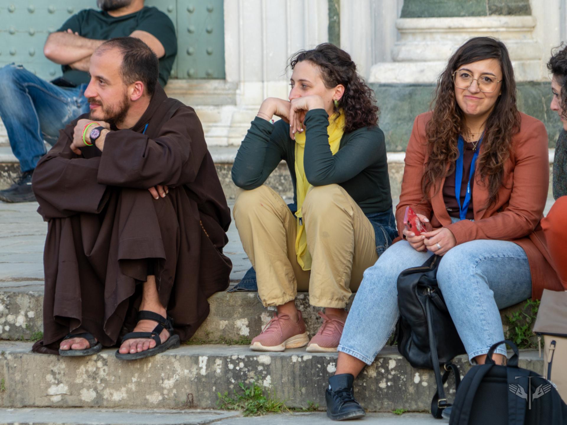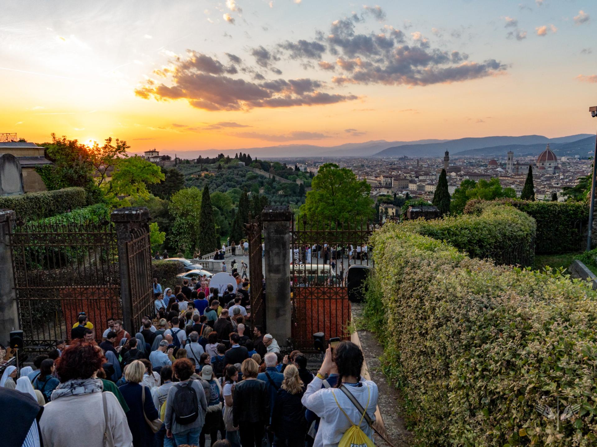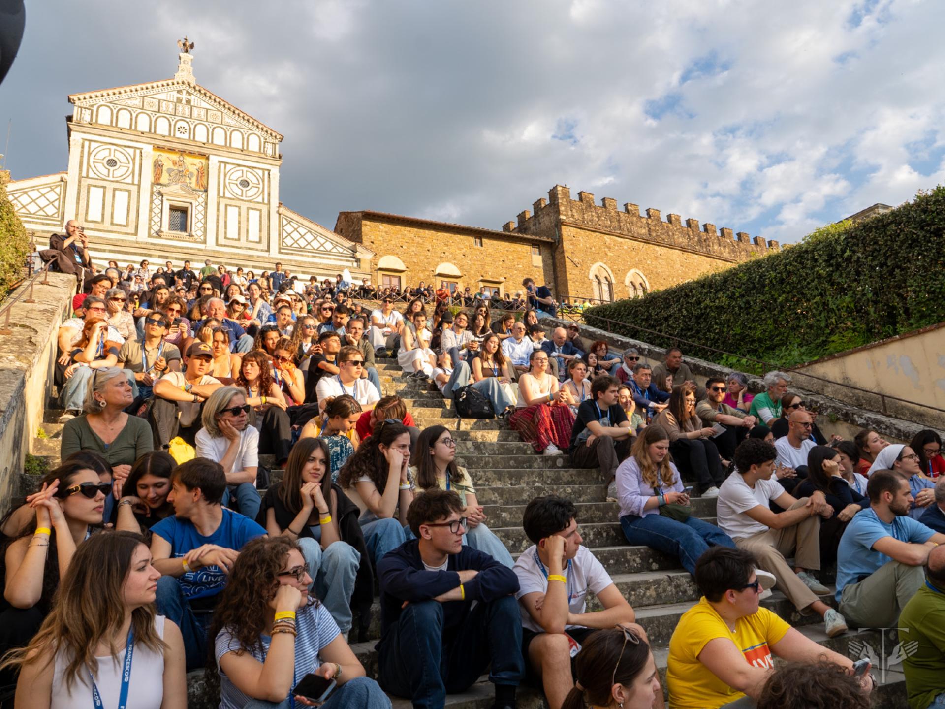 Nel tessuto urbano di Firenze, intanto, sono rimasti aperti i punti “Ti ascolto” tra Piazza della Signoria, San Firenze e Santa Croce, con la presenza di frati, religiose, psicologi e counselor, offrendo uno spazio perché le ferite del cuore e della mente potessero essere accolte. Si è svolta inoltre un’invocazione per la pace sulla scalinata di San Miniato al Monte, con la partecipazione di realtà come Rondine Cittadella della Pace, la Fondazione Giovanni Paolo II, la Pastorale Giovanile dell’Arcidiocesi di Firenze e il Centro La Pira. In questo stesso orizzonte si sono ascoltate le testimonianze di giovani provenienti da terre ferite dalla guerra.
