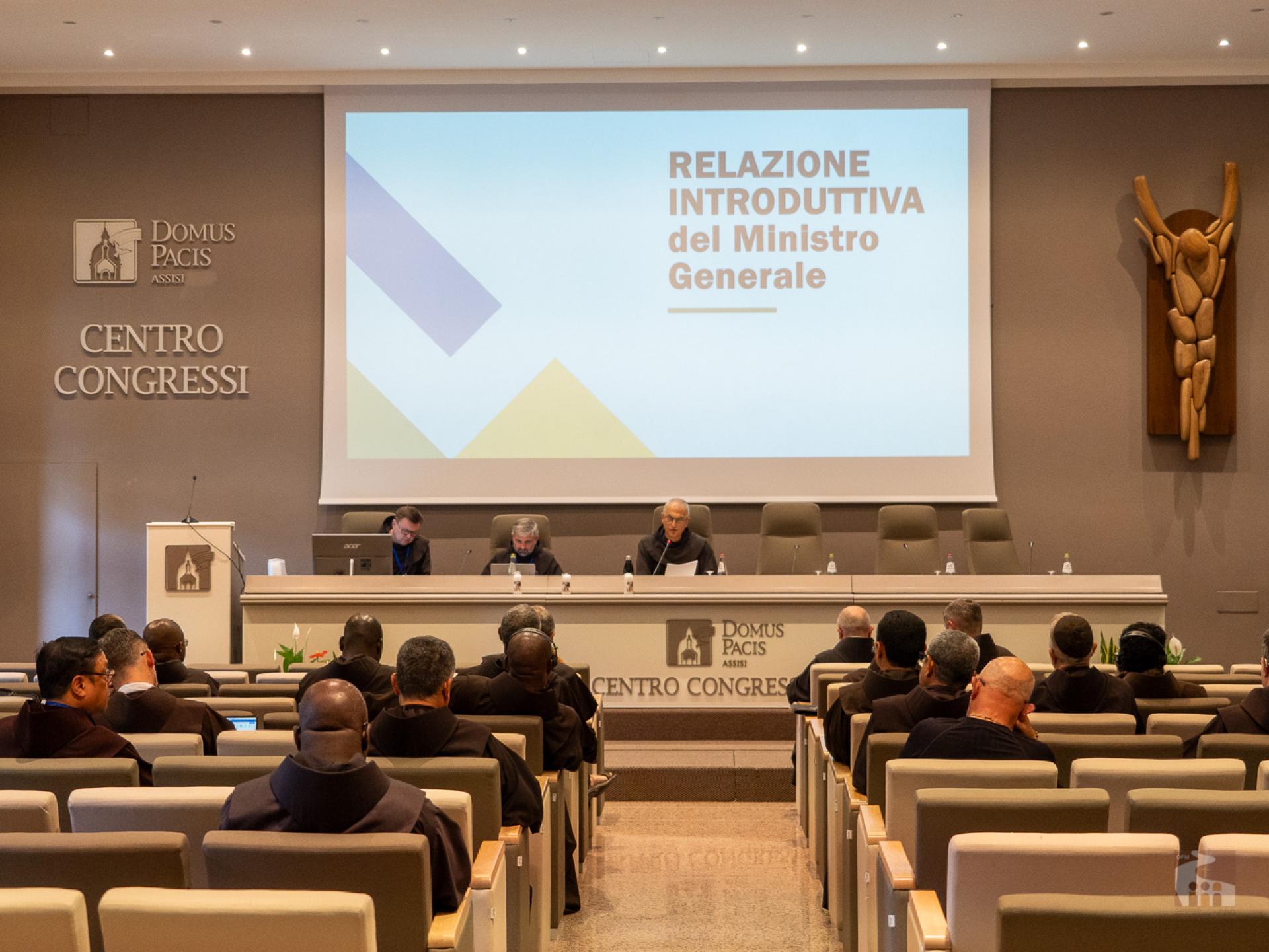 L'incontro è iniziato con la relazione del Ministro generale, Fr. Massimo Fusarelli, OFM, il quale ha sottolineato che il CPO nasce dalla grazia del Capitolo Internazionale delle Stuoie che si ha concluso lo stesso giorno. Per sette giorni, frati, religiose e laici membri della Famiglia Francescana di tutti i continenti hanno riflettuto sul carisma, la fraternità (comunione) e la missione nel nostro tempo.