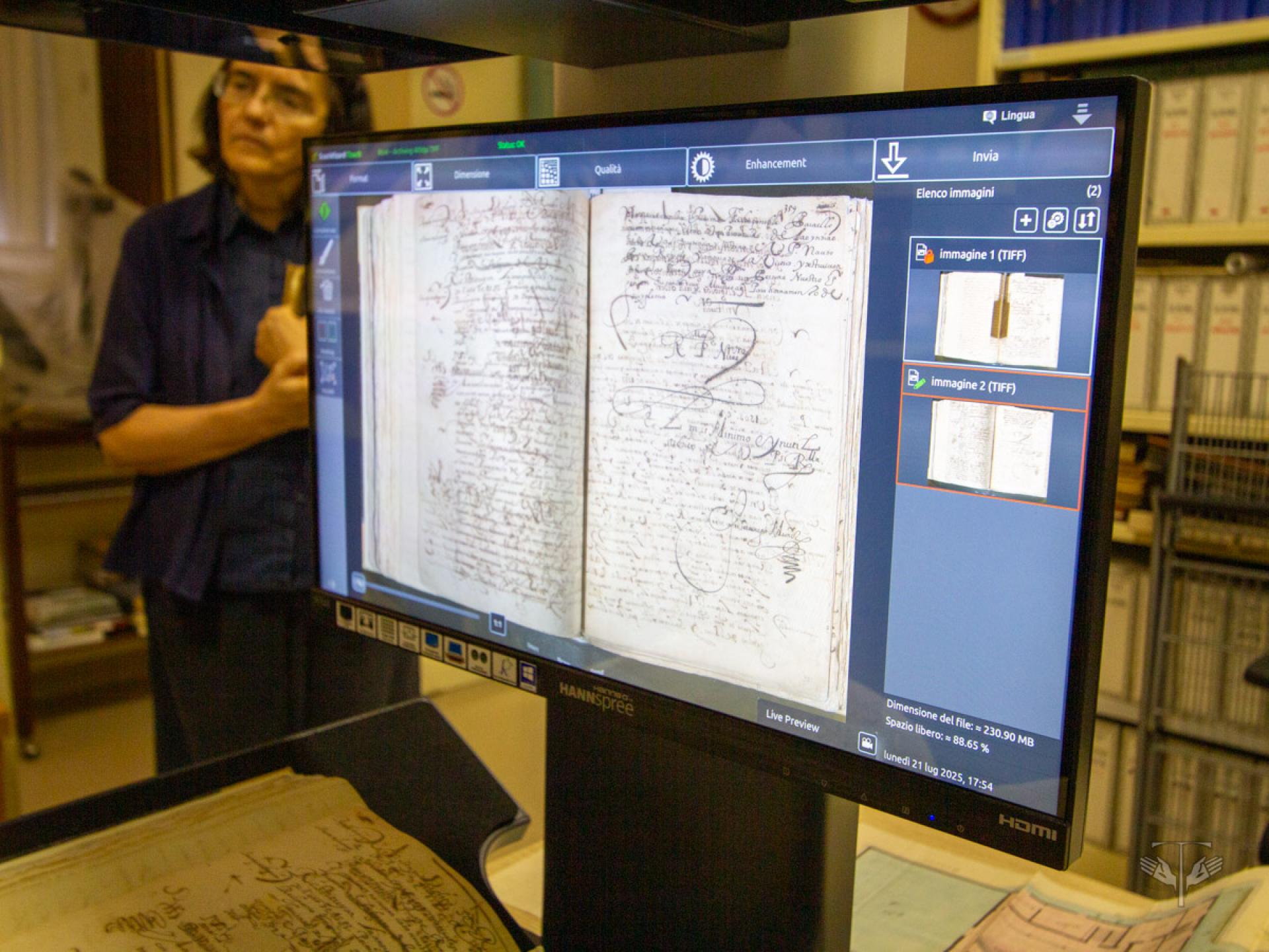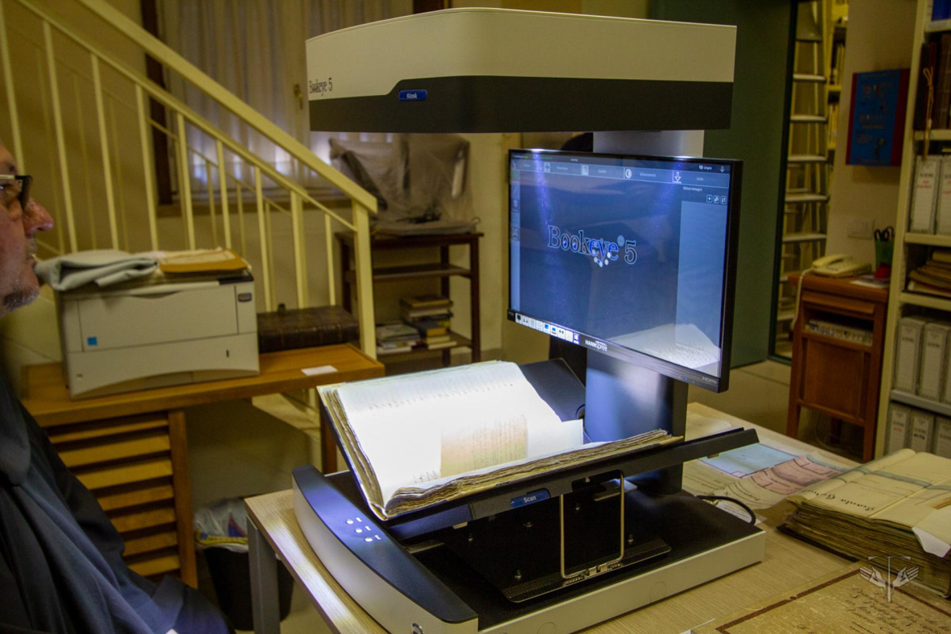 Procedendo nella sala successiva si va verso l’archivio vero e proprio, che secondo le norme vigenti per una ottimale conservazione dei documenti è un ambiente climatizzato, deumidificato, con regolare impianto antincendio e con scaffalature in metallo. Qui si trova anche un precisissimo scanner per la digitalizzazione dei documenti: rendendo possibile la consultazione digitale, si tutela la qualità degli originali cartacei evitandone il deterioramento.
