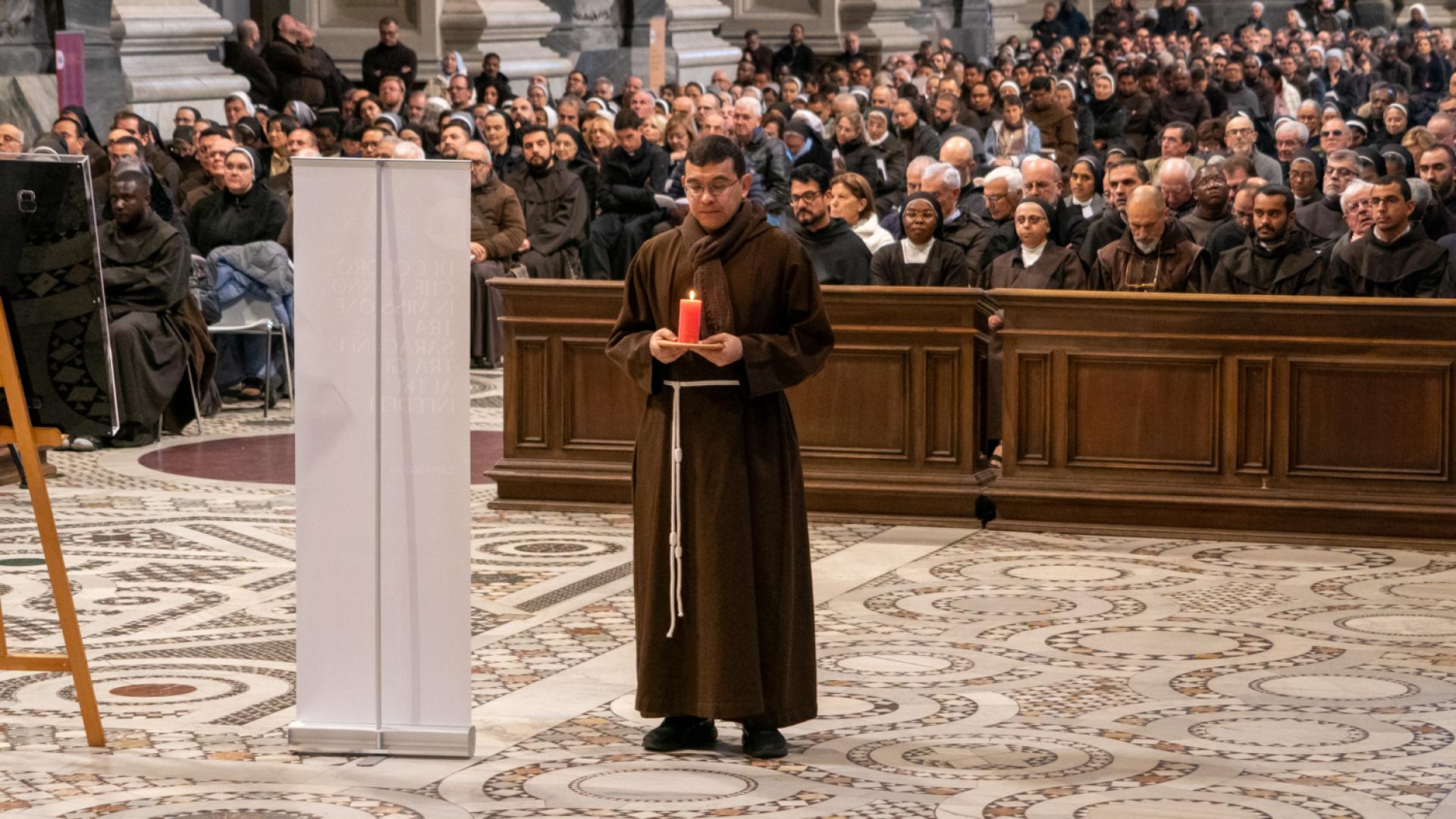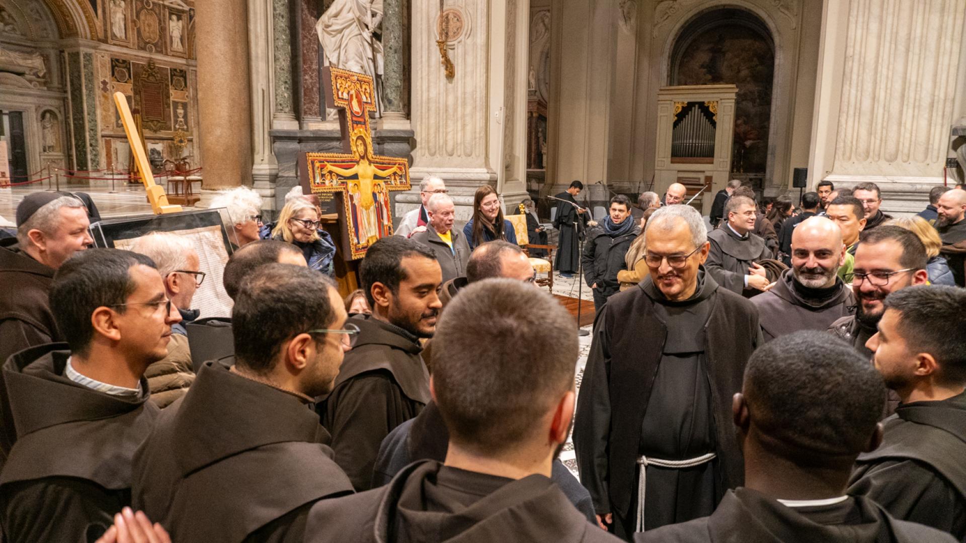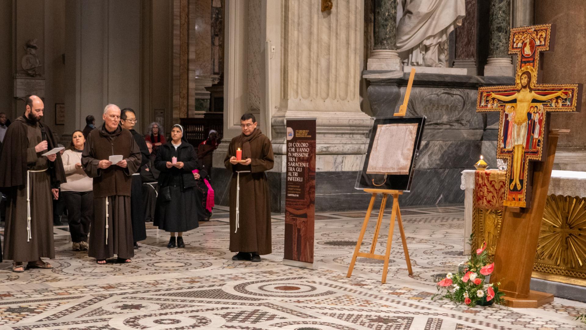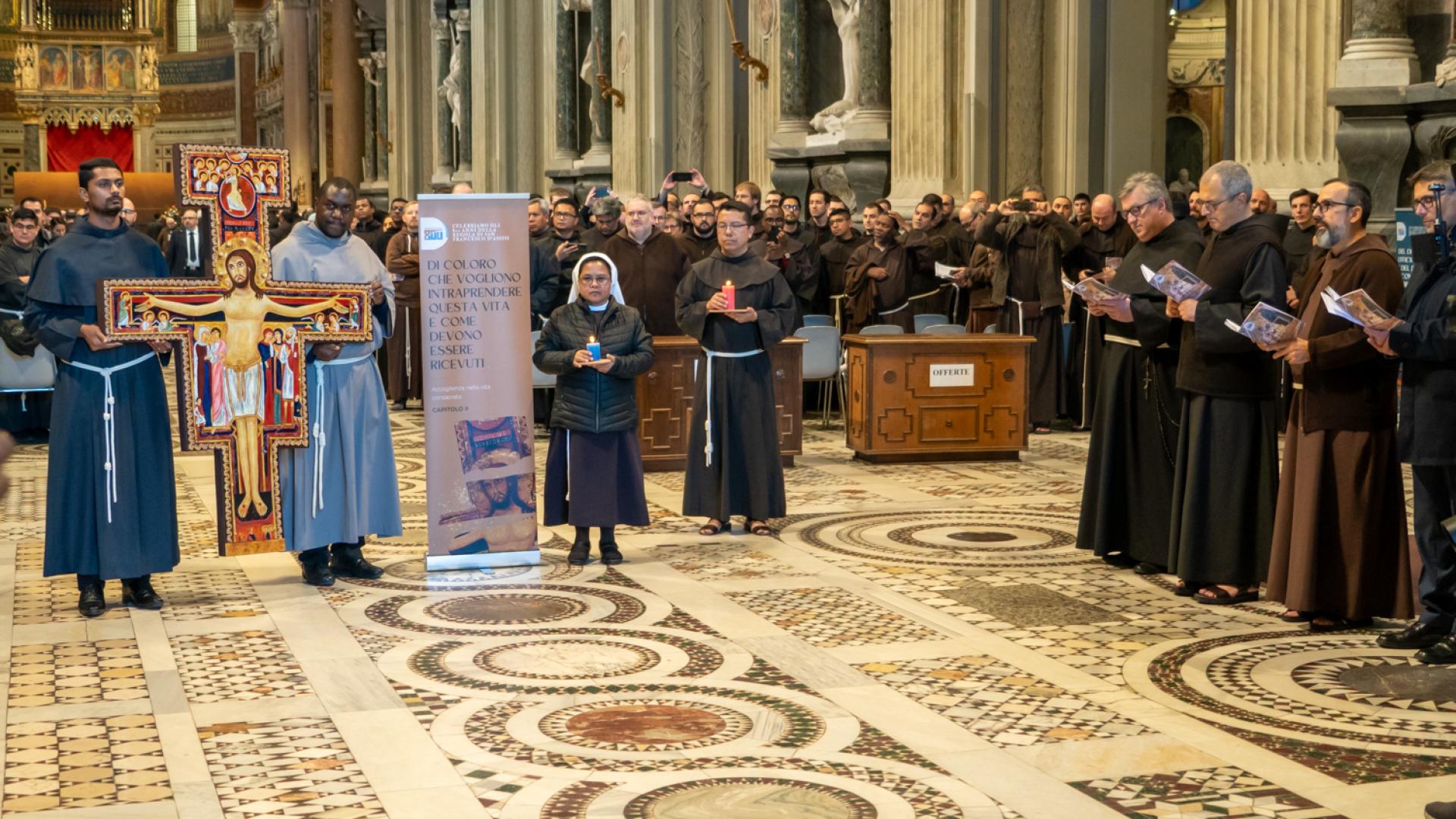 Anche se non presente fisicamente, Papa Francesco ha partecipato con un messaggio rivolto a tutti noi membri della famiglia francescana, letto dal cardinale Angelo De Donatis, vicario del Pontefice per la Diocesi di Roma, che ha presieduto la celebrazione: “Per San Francesco il Vangelo è stato al centro della sua esistenza; e la Chiesa ne ha approvato il proposito, riconsegnandolo a lui e a tutti voi francescani come un testo che non esprime più soltanto l’intuizione spirituale di un Fondatore, ma una forma di vita”. Ci ha ricordato che per vivere gli insegnamenti del Maestro è necessario rimanere nella Chiesa. E alla fine ci ha invitato ad andare per il mondo: “Per voi frati e sorelle francescani significa concretamente realizzare la vocazione itinerante in uno stile di fraternita e di vita pacifica, senza liti o dispute né tra voi né con gli altri, dando prova di ‘minorità’, con mitezza e mansuetudine, annunciando la pace del Signore e affidandovi alla provvidenza: è uno speciale programma di evangelizzazione, possibile a tutti”.